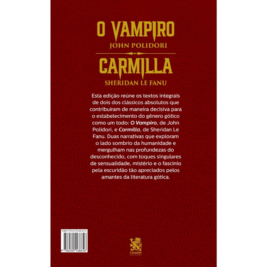 Esta edição reúne os textos integraisde dois dos clássicos absolutos quecontribuíram de maneira decisiva parao estabelecimento do gênero góticocomo um todo: O Vampiro, de JohnPolidori, e Carmilla, de Sheridan LeFanu. Duas narrativas que exploramo lado sombrio da humanidade emergulham nas profundezas dodesconhecido, com toques singularesde sensualidade, mistério e o fascíniopela escuridão tão apreciados pelosamantes da literatura gótica. ISBN13 :9786585168656 Páginas : 112 Publicação: 1ª Edição - 2023 Encadernação: Brochura Formato: 15,1 x 23,0 cm