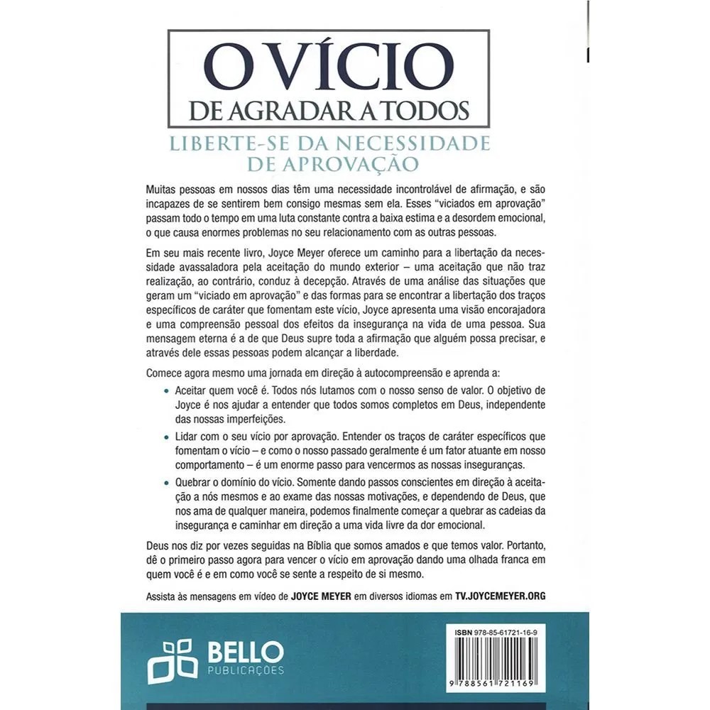 DESCRIÇÃO “O Vício de Agradar a Todos” aborda a luta silenciosa de muitos que vivem reféns da necessidade de aprovação alheia. Joyce Meyer ajuda você a identificar os padrões de insegurança que te perseguem, mostrar como isso prejudica seus relacionamentos e sua paz interior, e te conduz a uma libertação profunda: aceitar quem você é, reconhecer seu valor em Deus e viver com autenticidade. Com narrativas inspiradoras, insights bíblicos e exercícios práticos, este livro serve para quem sente o peso de precisar agradar o tempo todo — ideal para transformar pensamentos, emoções e estabelecer um relacionamento mais saudável consigo mesmo, com os outros e com Deus. FICHA TÉCNICA Título: O Vício de Agradar a Todos – Liberte-se da Necessidade de Aprovação Autor: Joyce Meyer Editora: Bello Publicações Formato: Brochura Páginas: 312 Peso: 430 g ISBN: 9788561721169 PALAVRAS-CHAVE vício de agradar, necessidade de aprovação, autoestima cristã, Joyce Meyer, brohura, livro autoajuda cristã, viver livre, autenticidade em Cristo