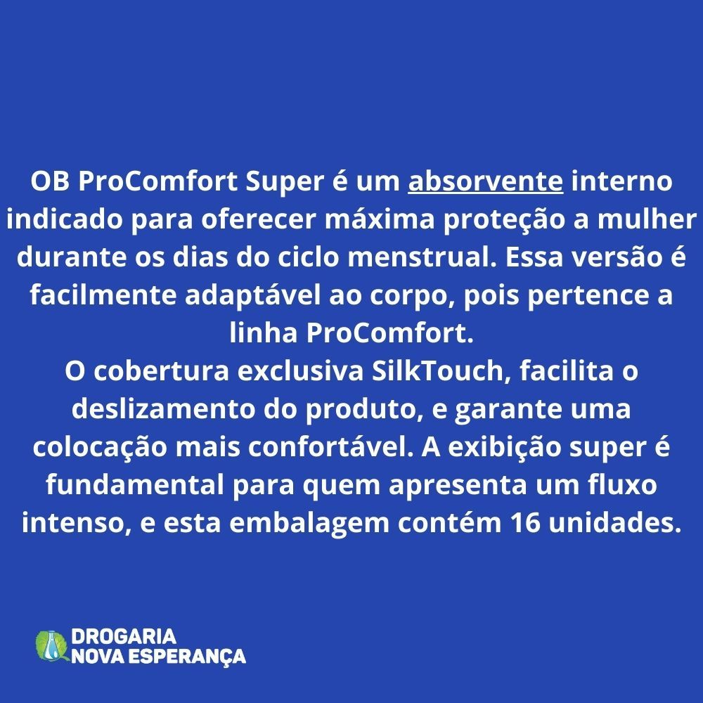 OB ProComfort Super é um absorvente interno indicado para: - Oferecer máxima proteção a mulher durante os dias do ciclo menstrual. Essa versão é facilmente adaptável ao corpo, pois pertence a linha ProComfort.