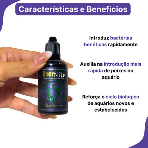 ITENS INCLUSO NO KIT (PRODUTOS ORIGINAIS - SOMO DISTRIBUIDOR AUTORIZADO) - 1 Ocean Blend 50ml - 1 Over Nite 50ml - 1 Start Up 50ml - OCEAN BLEND O Ocean Blend da Ocean Tech é um acelerador biológico constituído por grupos de bactérias que colaboram com a manutenção de Aquários de Água doce e Aquários Marinhos. Essas bactérias, são responsáveis por consumir os excessos de carga orgânica presentes no aquário (como por exemplo restos de ração, excrementos, algas e outros materiais em decomposição) e formam colônias dentro do filtro biológico. Com o uso frequente em seu aquário, o Ocean Blend proporciona muita mais do que apenas uma água mais limpa, também fornece algumas proteínas e vitaminas que servirão de complemento alimentar aos peixes, plantas naturais e corais. DOSAGEM (100 LITROS): 1º dia: 30ml 8º, 15º, 22º e 29º dia: 15ml Dosagem de manutenção semanal: 10ml - OVER NITE O Over Nite Ocean Tech é um acelerador biológico completo constituído por todos os grupos de bactérias que ajudam a realizar a ciclagem imediata de seu aquário. Tanto para Aquários de Água Doce como para Aquários Marinhos A partir do seu uso serão inseridas milhões de bactérias ativas, que permitirá a introdução imediata de peixes em seu aquário recém montado, ativando sua biologia. Desta forma, serão consumidos elementos que comumente são prejudiciais à saúde dos peixes, como por exemplo o Amônio/Amônia e o Nitrato. Podendo ser utilizado tanto em aquários novos quanto na manutenção de sistemas mais maturados, o Over Nite também impede a progressão de agentes patógenos, elevando assim a imunidade de seus peixes. DOSAGEM: Aquário novo: adicionar 15 ml para cada 100 litros a cada 2 dias durante uma semana, totalizando 4 doses; Aquário estabilizado: 15ml para cada 100 litros uma vez por mês ou após a introdução de novos animais. - START-UP * 100% natural; * Bactérias aquáticas selecionadas de ocorrência natural; * Milhões de bactérias por ml; * Rápida redução de amônia e nitrito; * Previne a síndrome do aquário novo; INSTRUÇÃO DE USO : Atenção: Instrução de uso para cada 100 litros: Para aquários novos: Dosagem inicial de 20ml no primeiro dia e 10ml a cada 48 horas durante um períodos de 14 dias. Para melhores resultados na ciclagem de novos aquários é fortemente aconselhável o uso de OT Oceanblend 24h a 48hr antes da adição de OT START-UP para iniciar o uso de processo de amonificação. Para Aquários estabilizados: Dosagem de 20ml sempre que efetuar trocas parciais, após a introdução de novos animais e ao término de tratamentos com medicamento e ou algicidas. OBSERVAÇÃO: Filtros UV devem ser desligados por um período de 48-72 horas após a introdução dos produtos. RECOMENDAÇÕES: Agite bastante antes do uso e mantenha longe do alcance de crianças e animais domésticos.