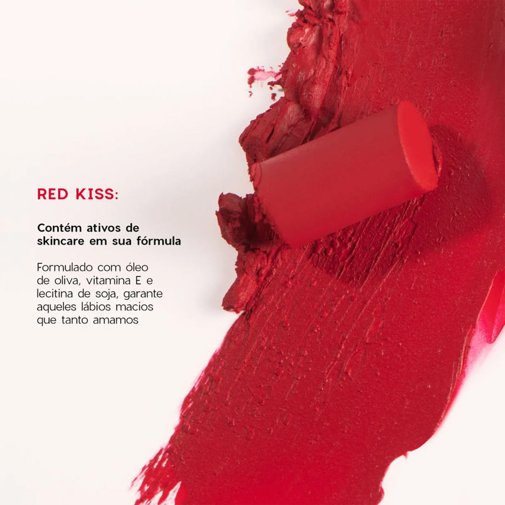 Océane Edition The Lipstick Red Kiss Vermelho - Mini Batom 2g Na cor Red Kiss, esse batom vermelho intenso combina perfeitamente com visuais mais ousados e personalidade forte. Enriquecido com óleo de oliva, vitamina e e lecitina de soja, que conferem textura e maciez ao seu batom. Possui pigmentação poderosa e duradoura, com cobertura semi-matte, super confortável. Conselho de Aplicação Aplique diretamente nos lábios.
