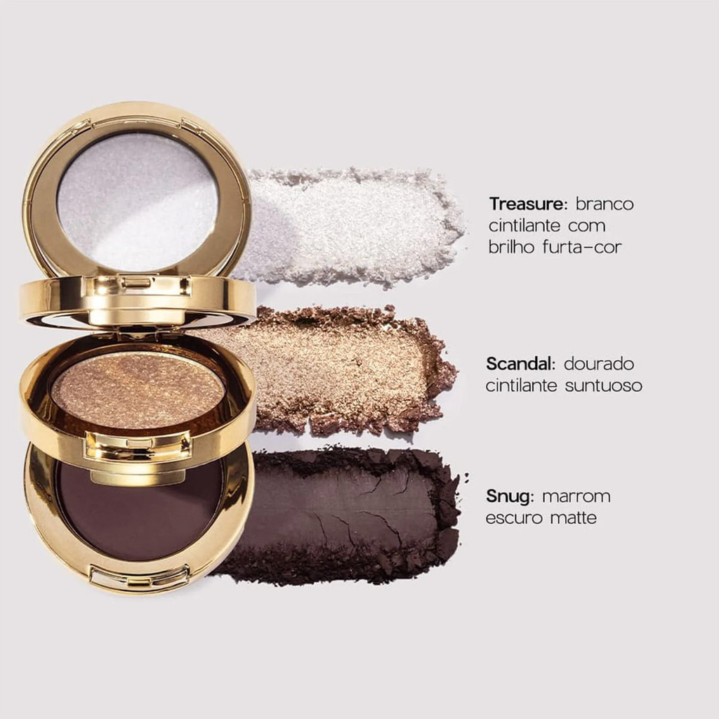 Océane Nádia Tambasco 3 To Go Jewel - Paleta de Sombras 7,8g Perfeita para criar looks sofisticados e românticos, esse trio de sombras é ideal para levar sempre em sua necessaire. Compacta, com formato stackable e espelho, facilita os retoques da make em qualquer ocasião. De longa duração e alta pigmentação, conta com três cores versáteis: 2 tons cintilantes e 1 tom matte. Conselho de Aplicação Escolha o tom e com a ajuda do pincel, aplique na pálpebra com batidinhas leves. Com um pincel de cerdas macias, esfume bem para dar o acabamento desejado.