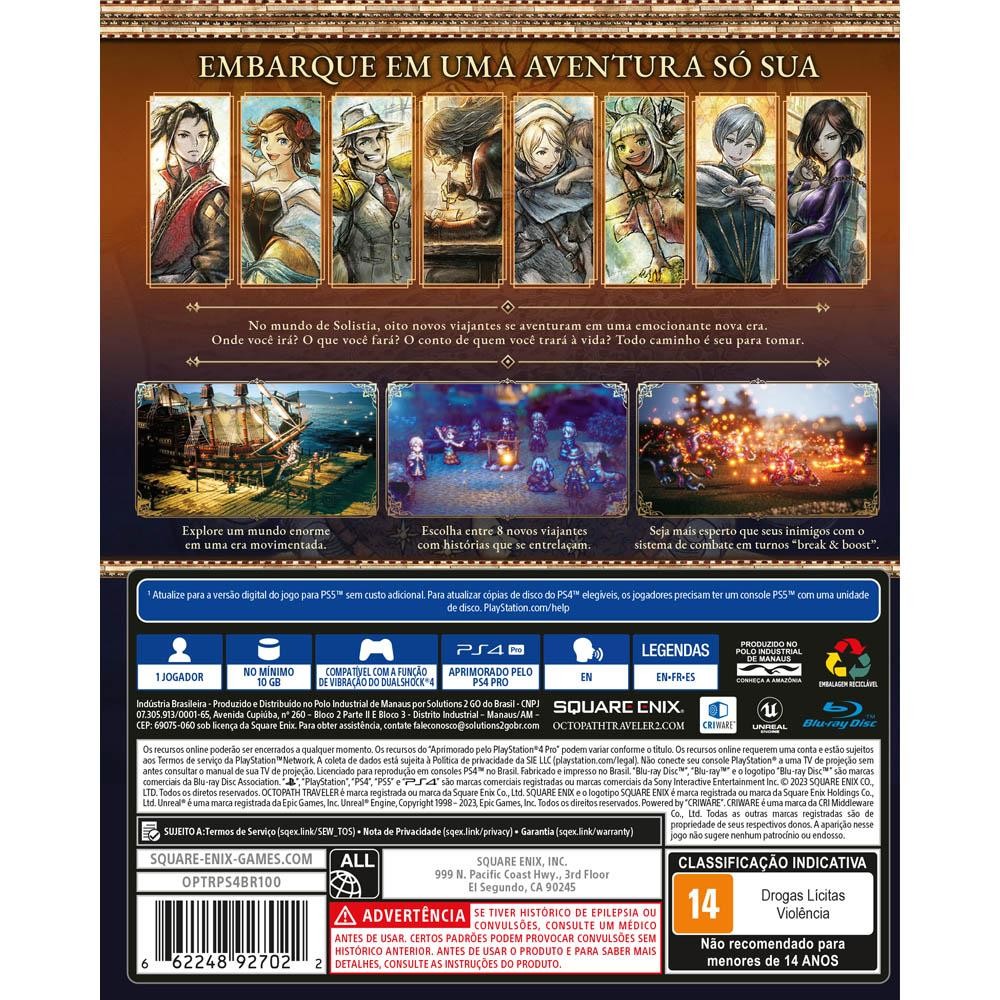 Octopath Traveler II - Playstation 4 Este é um novo jogo da franquia OCTOPATH TRAVELER, que teve o primeiro título lançado em 2018 e vendeu 3 milhões de cópias no mundo todo. Ele leva o visual HD-2D da franquia, uma mistura de arte retrô em pixels com 3D, para patamares ainda mais altos. No mundo de Solistia, oito novos viajantes adentram uma nova e empolgante era. Aonde você irá? O que você fará? Quais histórias você viverá? Você pode trilhar o caminho que quiser. Embarque em uma aventura só sua. Características: Funcionalidades do Jogo: Comece a sua aventura com um dos oito novos viajantes, que possuem origens, motivações e habilidades especiais diferentes. O visual HD-2D da franquia, uma mistura de arte retrô em pixels com 3D, alcança patamares ainda maiores. A história se passa em Solistia, um lugar onde culturas diferentes prosperam de leste a oeste e as indústrias da nova era estão a todo vapor. Você pode navegar os mares e explorar cada canto deste mundo, que varia do dia para a noite. Cada viajante tem um conjunto próprio de ações especiais (Path Actions) que podem ser usadas para enfrentar habitantes das cidades, obter itens, convidar outros para acompanhá-los em suas viagens e mais. Aonde você irá? O que você fará? Você pode trilhar o caminho que quiser. Mecânicas do primeiro jogo estão de volta, como a liberdade para desenvolver as classes e as habilidades dos viajantes, assim como o sistema de Break e Boost, que deixa as batalhas muito mais emocionantes. Novas mecânicas também foram adicionadas. Plataforma: Playstation 4 Publisher: Square Enix Espaço em Disco: Min 10GB Gênero: RPG Quantidade de Jogadores: 1 jogador Offline Idioma: Áudio: Inglês, Japonês / Legendas: Inglês, Japonês, Português Classificação Indicativa: 14 Anos - Drogas Lícitas, Violência Ano de Lançamento: 2023 Conteúdo da Embalagem: 1 - Octopath Traveler II - Playstation 4 Garantia: 12 meses contra defeito de Fabricação. Imagens meramente ilustrativas.