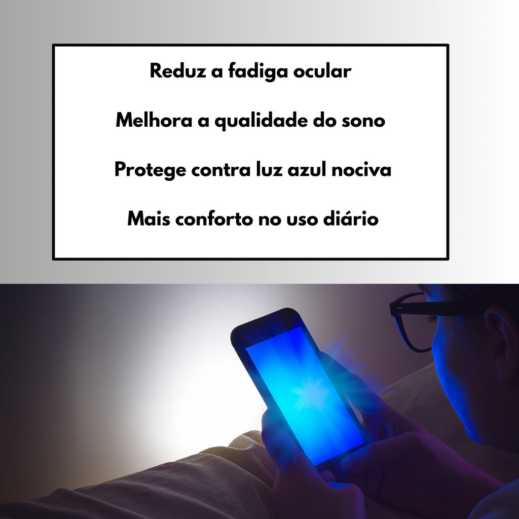 exposição constante à luz azul de celulares, computadores e outros dispositivos eletrônicos, somada à ação dos raios UVA e UVB, pode causar fadiga ocular, insônia e danos à saúde dos olhos. Este modelo de óculos oferece 80% de proteção contra a luz azul e filtro eficaz contra raios UV, ajudando a reduzir dores de cabeça, vermelhidão, tonturas e diminuindo o risco de problemas mais sérios, como a degeneração macular. Com um design elegante e atemporal, são leves, confortáveis e se adaptam a qualquer estilo. As lentes levemente azuladas proporcionam uma proteção discreta e eficiente, ideais para o uso no dia a dia. Indicados especialmente para quem passa horas em frente a telas, estes óculos oferecem alívio imediato do cansaço ocular, mais conforto visual e praticidade para cuidar da saúde dos olhos — sempre com elegância. Obs; Enviaremos os cases de guardar o óculos conforme a disponibilidade de modelo em estoque.