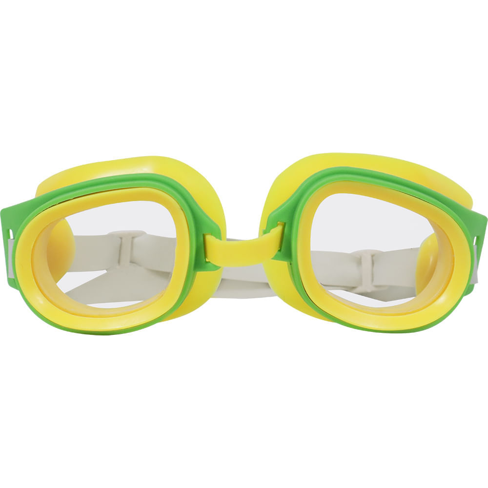 ATENÇÃO: Esse produto é enviado em cores/estampas sortidas, de acordo com estoque disponível. Óculos de Natação Infantil · Material resistente e flexível · Lentes em PS com PVC ao redor · Tiras de borracha · Disponível nas cores: Roxo/Amarelo, Verde/Amarelo, Azul/Amarelo e Rosa/Amarelo