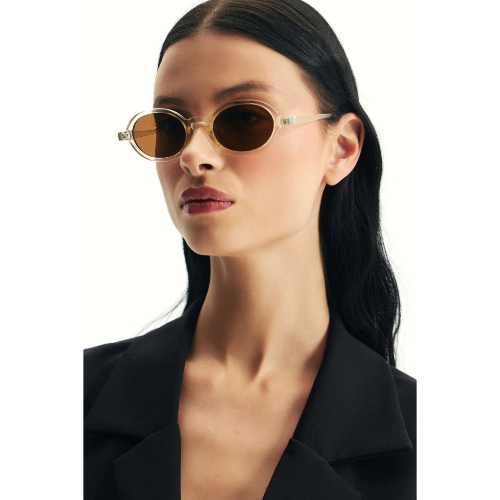 Óculos de Sol Oval Nice Champagne — Sofisticação sutil com toque retrô Este modelo combina delicadeza e elegância com sua armação translúcida em tom champagne e lentes marrons que complementam cada traço com suavidade. O design oval acrescenta leveza e adaptabilidade, ideal para diferentes estilos. Além da estética refinada, oferece proteção UV400 completa, garantindo 100% de bloqueio dos raios UV. Sua leveza e encaixe equilibrado tornam o uso confortável, perfeito para uso diário em diversas ocasiões. Benefícios: Armação translúcida champagne para visual leve e sofisticado Lentes marrons com proteção 100% contra raios UVA/UVB Design oval atemporal que se encaixa bem em todos os looks Modelo unissex, versátil e elegante Dimensões (em cm): Frente total: 14,3 cm | Lente: 5,3 cm | Ponte: 1,6 cm | Haste: 14,3 cm
