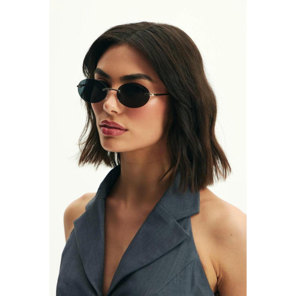 Óculos de Sol Oval Nina com Lente Preta — Minimalismo com elegância refinada Captando a essência do design moderno com toque retrô, o Óculos de Sol Oval Nina apresenta um formato oval sem aro, conferindo leveza máxima ao visual. Com hastes metálicas douradas, traz sofisticação com simplicidade — ideal para quem busca estilo urbano e discreto. Este modelo oferece proteção UV400 completa, assegurando 100% de bloqueio dos raios solares prejudiciais. Sua estrutura leve e design atemporal o tornam perfeito para uso diário em diferentes ocasiões. Benefícios: Visual elegante e leve, combinando forma retrô com minimalismo atual Hastes metálicas douradas que complementam qualquer look Proteção total contra raios UVA e UVB (UV400) Confortável para uso prolongado com encaixe suave e equilibrado Design unissex que se adapta facilmente a diferentes estilos Dimensões (em cm): Frente: 13,7 cm | Lente: 5,6 cm | Ponte: 1,8 cm | Haste: 14,0 cm