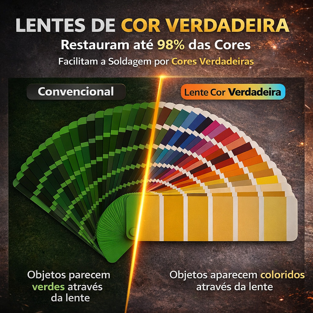 Óculos de Solda Automático com Escurecimento Solar Óculos de solda automático com escurecimento instantâneo, ideal para trabalhos de soldagem e corte. Possui lente com proteção contra raios UV e infravermelho, oferecendo maior segurança para os olhos durante o uso. Óculos de solda automático com lente de cor verdadeira, desenvolvido para proporcionar visão realista durante a soldagem. Diferente das lentes comuns esverdeadas, a tecnologia True Color permite enxergar as cores reais do ambiente, oferecendo mais precisão, conforto visual e segurança. Conta com duas formas de utilização, podendo ser usado com haste ajustável ou com elástico ajustável, garantindo conforto, firmeza e adaptação perfeita ao rosto. Equipado com sensor solar automático, escurece ao detectar o arco de solda e clareia automaticamente após o término, proporcionando praticidade e produtividade no trabalho. Indicado para uso em solda elétrica, soldagem MIG, TIG, eletrodo revestido, corte e serviços industriais ou domésticos. Principais características: Óculos para solda automática Lente com escurecimento automático solar Proteção UV e infravermelha Dupla opção de uso: haste ou elástico ajustável Estrutura resistente e leve Lente substituível Ideal para soldador profissional e hobby Maior segurança, conforto e visibilidade Conteúdo da Embalagem 1 Óculos de solda automático com escurecimento solar 1 Elástico ajustável para uso na cabeça 1 Par de hastes flexivéis