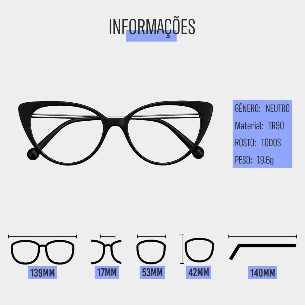 👓 Armação Olho de Gato Retrô Feminina – Leve, Estilosa e Confortável Transforme seu visual com elegância e praticidade! Essa armação no formato olho de gato, feita em TR90, combina leveza (apenas 19,6 g) com resistência e durabilidade, ideal para uso diário. 💎 Versátil: desenvolvida para receber lentes de grau (miopia, hipermetropia ou astigmatismo), proporcionando conforto e estilo em qualquer ocasião. 🌐 Proteção extra: acompanha lentes com bloqueio de luz azul e proteção UV400, ajudando a reduzir o cansaço visual em frente a telas e proteger seus olhos da radiação solar. 📏 Dimensões da armação: Largura frontal: 139mm Comprimento da haste: 140mm Altura da lente: 49mm Largura da lente: 53mm Ponte: 17mm Peso: 19,6g 🎨 Cores disponíveis: Preto, Preto Brilhante, Cinza Transparente, Azul Transparente, Marrom, Marrom Transparente, Roxo Transparente e Verde Transparente. ✨ Destaques: Estilo retrô moderno em formato olho de gato Material TR90: resistente e confortável Super leve (menos de 20g) Pode ser usado como armação para lentes de grau Lentes que acompanham o produto têm bloqueio de luz azul e proteção UV400 ❓ Dúvidas? Fale conosco, estamos à disposição! 🚚 Envio rápido para todo o Brasil – receba seus óculos com agilidade e segurança.