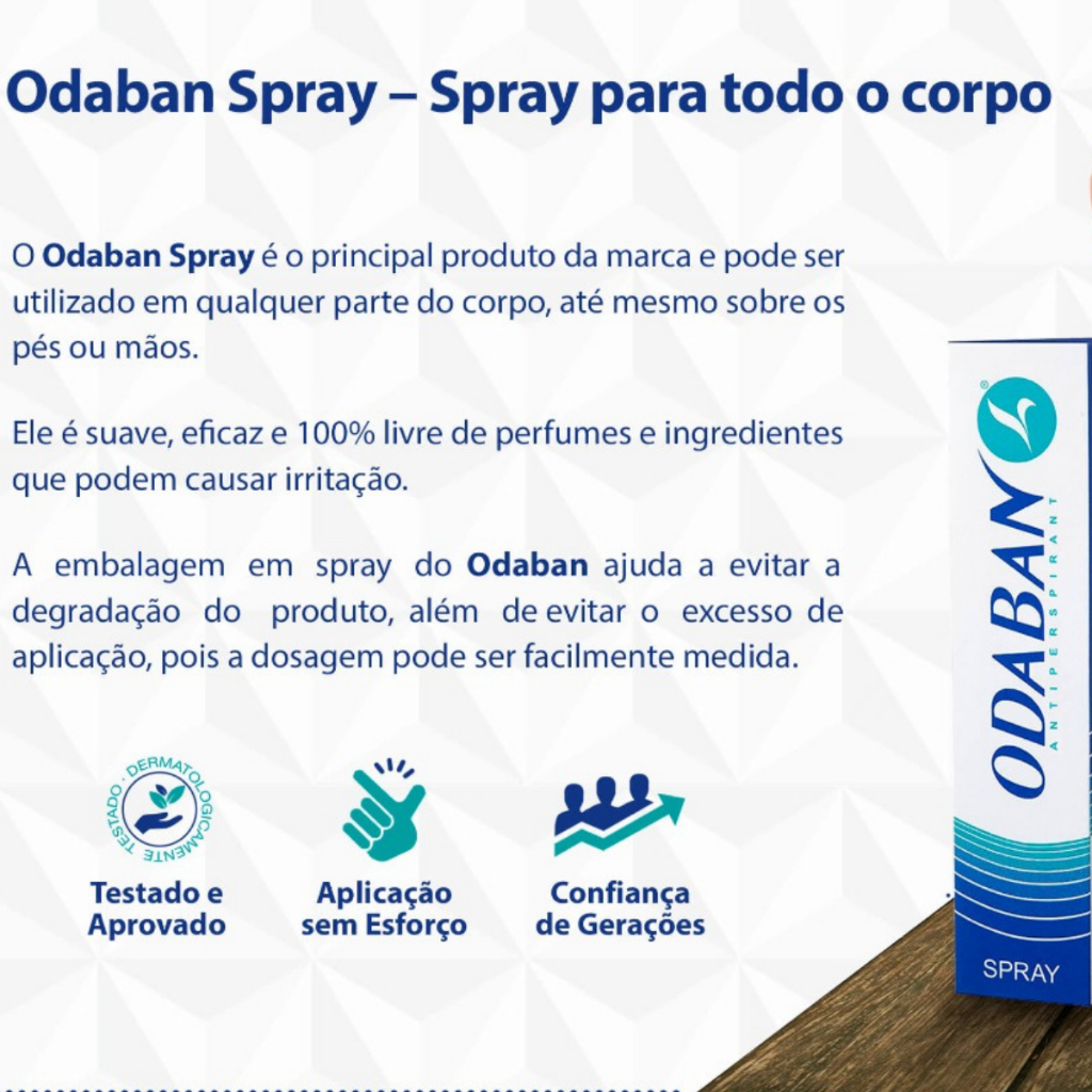 **Descrição do Produto: Odaban - Spray Antitranspirante** SOMOS AUTORIZADOS DA MARCA. 01 - unidade Odaban Desodorante Spray 30ML - Original Produto 100% Original a Pronta Entrega com envio imediato. Registro na ANVISA: 25351.072496/2018-00 **Odaban** é o antitranspirante de alta performance, desenvolvido para combater o suor excessivo e o mau odor de forma eficaz e duradoura. Ideal para quem busca uma solução prática e discreta, Odaban oferece proteção durante todo o dia, proporcionando uma sensação de frescor e conforto. Perfeito para uso diário, seja em climas quentes ou em situações de maior esforço físico. --- **Qualidade e Eficácia** - Desenvolvido com tecnologia avançada, Odaban age diretamente nas glândulas sudoríparas, controlando a produção de suor. - Fórmula testada dermatologicamente, proporcionando uma proteção eficiente sem danificar a pele. - Resultados visíveis em poucas aplicações, oferecendo até 7 dias de proteção contra o suor excessivo. --- **Usabilidade** - **Fácil de aplicar:** Odaban vem em formato spray, permitindo uma aplicação prática e precisa nas áreas desejadas, como axilas, mãos e pés. - **Discreto e confortável:** O produto seca rapidamente, não deixando resíduos e permitindo o uso de roupas imediatamente após a aplicação. - **Uso contínuo:** Pode ser aplicado diariamente para manter a eficácia, garantindo proteção prolongada. --- **Vantagens** - **Controle prolongado do suor:** Proteção eficaz que dura até 7 dias, mesmo em condições de calor intenso ou atividades físicas intensas. - **Sem manchas nas roupas:** Sua fórmula de secagem rápida evita o surgimento de manchas nas roupas, mantendo seu visual sempre limpo e sem resíduos. - **Para todos os tipos de pele:** Ideal para peles sensíveis, proporcionando conforto sem causar irritações ou alergias. - **Versatilidade de aplicação:** Pode ser usado em diversas partes do corpo, como axilas, pés e mãos, garantindo uma sensação de frescor por todo o dia. --- **Características** - **Conteúdo:** 30ml (ideal para uso prolongado). - **Modo de uso:** Aplicar a uma distância de 15 a 20 cm da pele, de preferência à noite antes de dormir. Não aplicar em pele irritada ou lesionada. - **Formulação:** Sem álcool, sem parabenos e dermatologicamente testado. - **Duração:** Até 7 dias de proteção contínua, dependendo da intensidade da transpiração. --- Com Odaban, você garante uma solução confiável e de longa duração para o controle do suor e mau odor, tornando seu dia a dia mais confortável e sem preocupações. Experimente agora e sinta a diferença!
