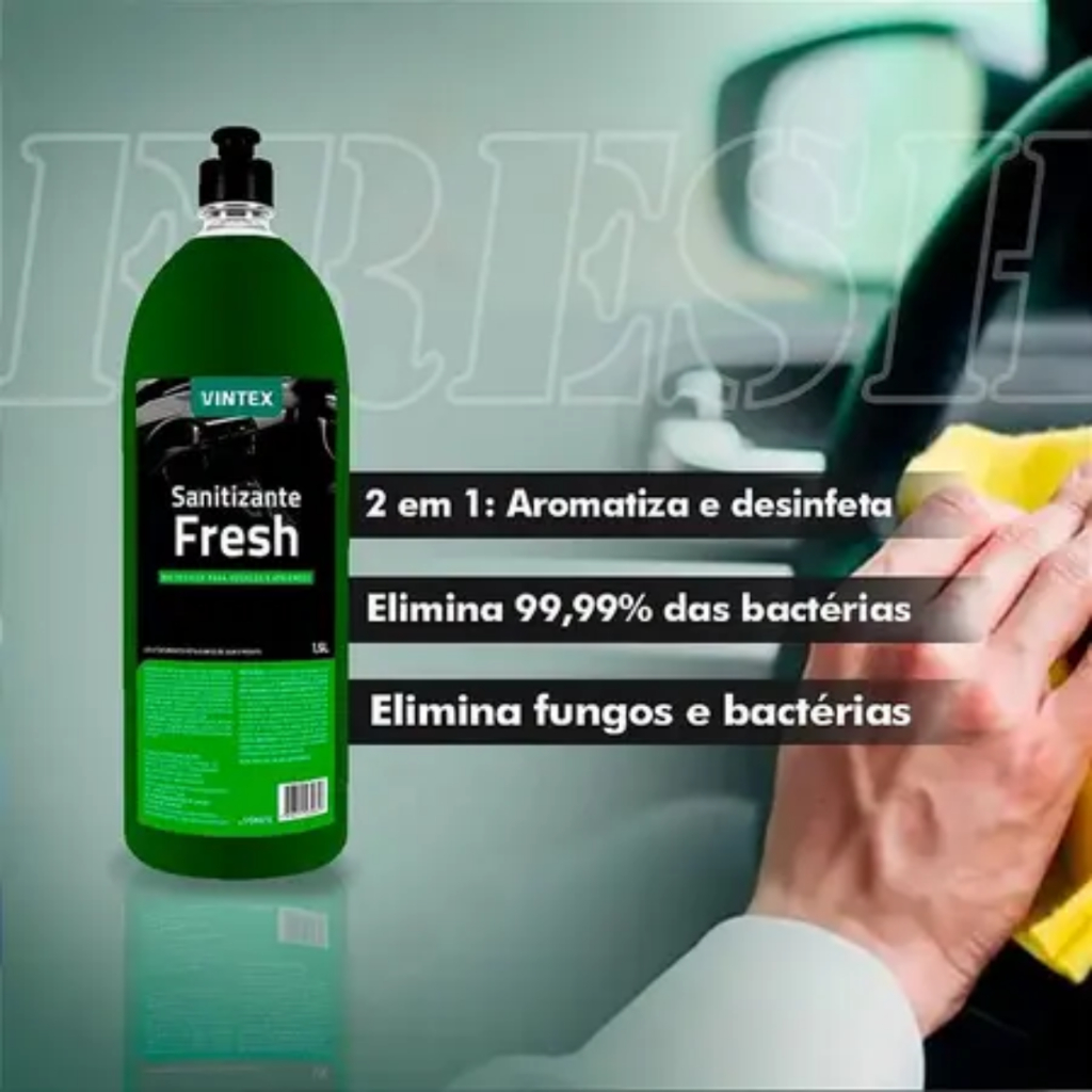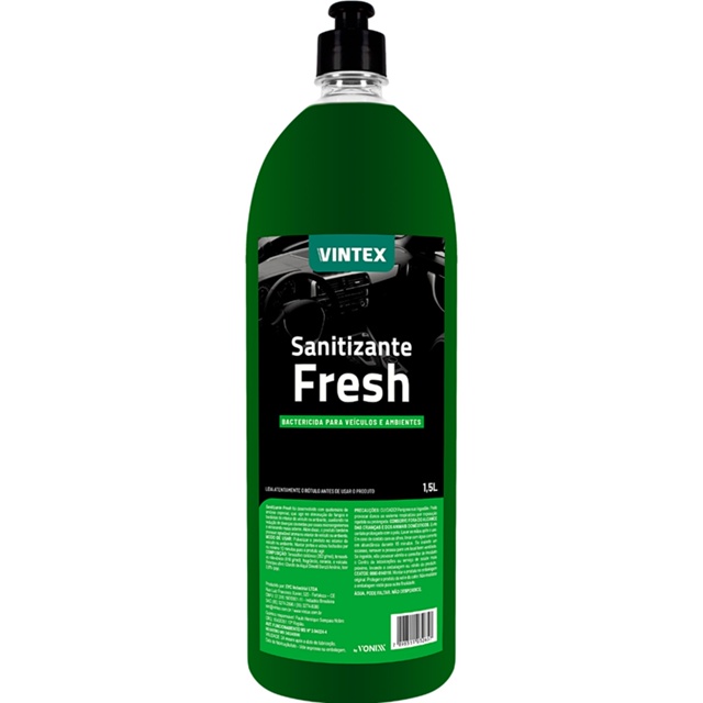 SANITIZANTE FRESH 1,5L VINTEX DESCRIÇÃO: Sanitizante Fresh foi desenvolvido com quaternário de amônio especial, que age na eliminação de fungos e bactérias do interior do veículo ou ambiente, auxiliando na redução de doenças causadas por esses microorganismos e eliminando maus odores. Além disso, o produto também promove agradável aroma no interior do veículo ou ambiente MODO DE USO: 1. Pulverizar o produto no interior do veículo ou ambiente 2. Manter portas e vidros fechados por no mínimo 10 minutos para o produto agir