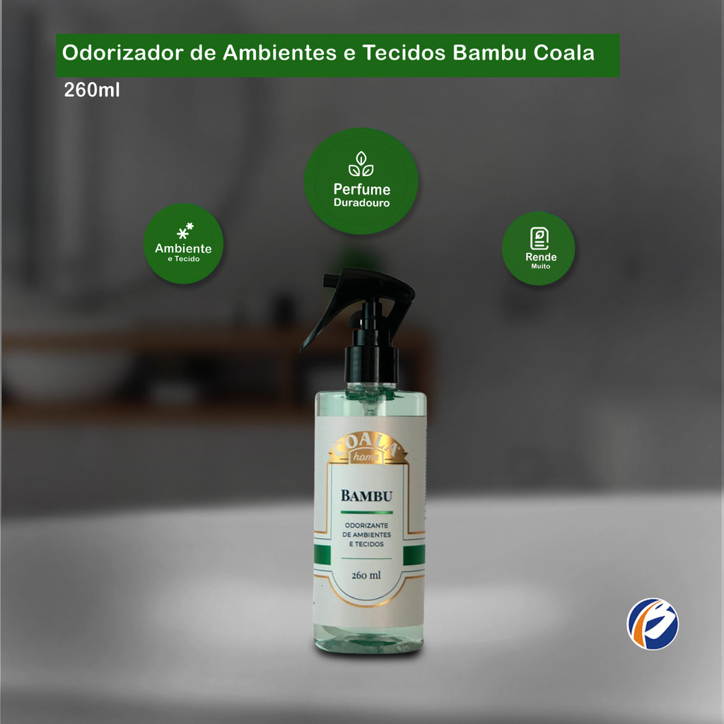 Odorizador de Ambientes e Tecidos Bambu 260ml Coala O Coala Odorizante de Ambientes e Tecidos é uma opção super prática e rápida para garantir um ambiente perfumado e com sensação agradável. Indicação de Uso: - Este produto foi especialmente desenvolvido para aromatizar os ambientes e tecidos da sua casa, proporcionando a agradável sensação de um ambiente perfumado. Modo de uso: - Aplique o produto no ambiente desejado, com rápidas pulverizadas, posicionando o jato para cima, fazendo com que suas partículas se espalhem melhor pelo ambiente. Fragrância: Bambu Embalagem: 01 Frasco de 260ml