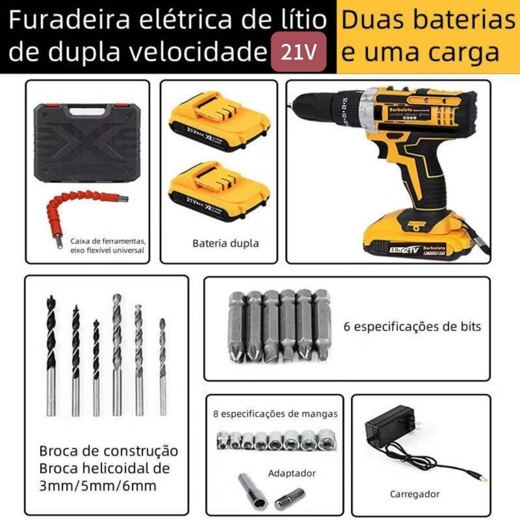 Oferta especial Kit Furadeira Parafusadeira 21V com Impacto 13mm Sem Fio + 2 Baterias