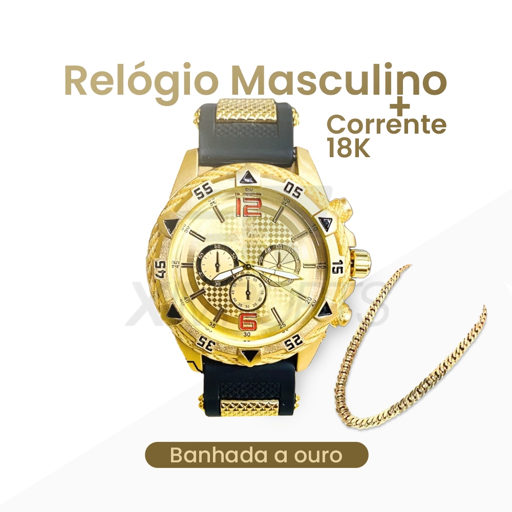 🔥OFERTA🔥 🔥Kit Relógio Masculino Dourado + Corrente Banhada Grossa 18K🔥