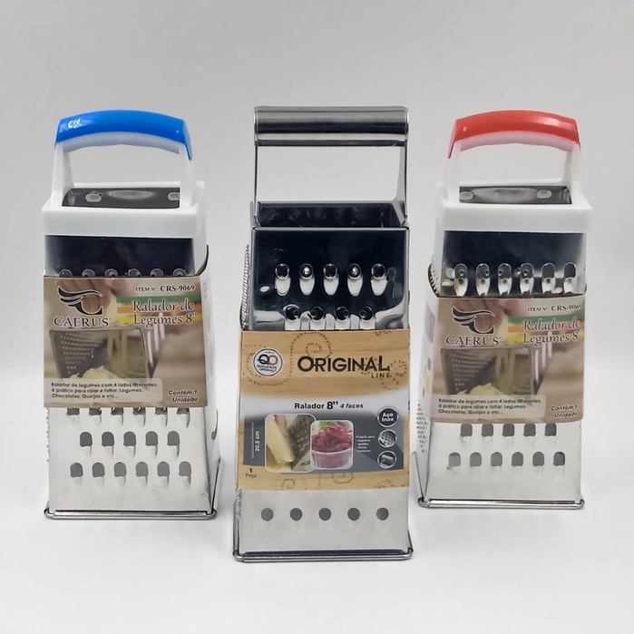 AVISO!!!! Ralador de 8" SERÁ ENVIADO DE ACORDO COM O ESTOQUE Os Raladores da Original Line é com certeza o utensílio perfeito para o seu dia a dia. Composto de 4 faces com diferentes tipos de lâminas, proporciona variados cortes para seus legumes, frutas, queijos e verduras. Destaque para sua durabilidade. Cuidados: • Para manter seus utensílios sempre brilhando, lave com esponja macia, sabão ou detergente neutro. Produtos abrasivos como palha de aço podem riscar e prejudicar o brilho • Seque imediatamente para evitar manchas • Recomenda-se o uso de água quente para melhorar o brilho • Não guarde em local úmido, a umidade pode provocar manchas. Marca: ORIGINAL LINE REF: SL0231 Tamanho: 18cm REF: WX3893 Tamanho 8'': 20cm (emborrachado na parte inferior) REF: CR9069 Tamanho 8": 20,5cm REF: SL0225 Tamanho 8": 20,5cm