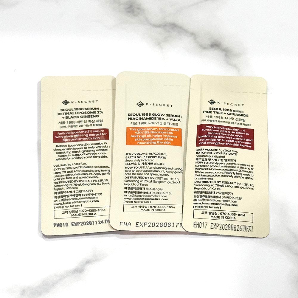 Kit Mini Trial de LIGA 1988 (3pçs x 1g) Conjunto de partida de proteção UV de Retinal + clareamento + proteção UV Um kit de cuidados com A pele de viagem com três produtos mais vendidos da linha SEOUL 1988 - projetado para melhorar A textura da pele, iluminar o tom e proteger dos danos UV. Perfeito para uso experimental, viagens ou introdução de uma rotina completa de cuidados com a pele em um conjunto. ✨ POR QUE VOCÊ VAI AMAR 💗 Rotina de cuidados com a pele completa em um conjunto Sérum Sérum (anti-envelhecimento) Sérum Sérum (iluminação) Protetor solar protetor solar (proteção UV) 👉 Rotina diária fácil em tamanho mini ✨ Ingredientes funcionais avançados com ingredientes funcionais avançados Inclui extratos retina, niacinamida e ricos em antioxidantes 👉 Ajuda a melhorar a textura da pele, o tom e a elasticidade da pele 👜 Ensaio perfeito/tamanho de viagem Amostras compactas de 1g compactas para fácil transporte 🌿 Condicionamento da pele e cuidados com o brilho da pele Ajuda a refinar os poros, suavizar a pele e melhorar o brilho geral 🧴 OPÇÕES (conjunto ) 1. Retinal Retinal Preto Sérum Ginseng 1g Retinal + complexo de ginseng preto Ajuda a melhorar linhas finas, elasticidade e textura da pele 👉 Melhor para anti-envelhecimento e renovação da pele 2. Sérum Niacin Yuja 1g Niacinamida + extrato de yuja Clareia a pele sem brilho e melhora o tom irregular 👉 Melhor para clarear e cuidar de brilho 3. Creme Solar Pine Tree Sun 1g Protetor solar leve com cuidado calmante Protege a pele enquanto mantém a hidratação 👉 Melhor para proteção UV diária 🫧 Modo de usar Aplique o soro após o toner 2 Use protetor solar como último passo (manhã) 3 Use o soro retina de preferência à noite 📦 INFO DO Produto Tipo de produto: Kit de teste de cuidados com a pele (3 peças) Volume de Volume: 1g x 3 Tipo de pele: Todos os tipos de pele