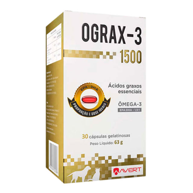 OGRAX-3 1500 PARA CÃES E GATOS USO VETERINÁRIO 30 CÁPSULAS GELATINOSAS Ácidos graxos essenciais. Proporção e dose ideais. Ômega-3. EPA: DHA - 1,5:1. Ograx-3 1500 é um suplemento nutricional composto