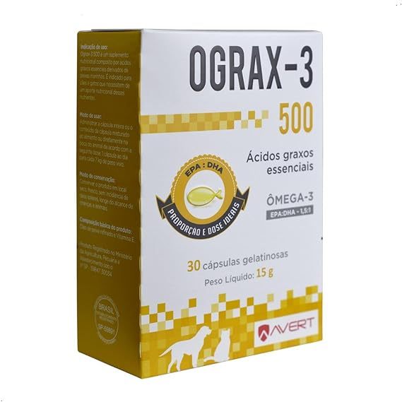 Ograx-3 Suplemento Nutricional Cães E Gatos 500mg - 30 Cápsulas OGRAX-3 500 é um suplemento nutricional composto por ÁCIDOS GRAXOS ESSENCIAIS (EPA + DHA), derivados de óleos de peixes marinhos de águas frias. Fornece predominante EPA (ácido eicosapentaenoico). Ograx-3 é um suplemento nutricional que retarda o envelhecimento celular, auxilia no controle da dor e minimiza reações inflamatórias crônicas, protege as funções renal e cardíaca, contém ômega 3, reduz a coceira em casos de doenças de pele. Indicação de uso Indicado para cães e gatos em qualquer idade, que se beneficiem do aporte desses nutrientes. 1 cápsula para cada 7kg de peso corporal. Composição Óleo de peixe refinado. Níveis de Garantia Por Kg Por Cápsula Ác. Eicosapentaenoico - EPA (mín.) 260 g 130 mg Ác. Docosahexaenoico ? DHA (mín.) 170 g 85 mg Vitamina E (min.) 440 UI/Kg 0,22 UI
