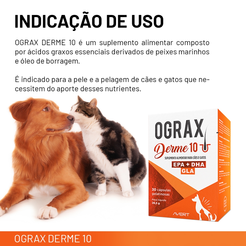 Ograx Derme 10 EPA+DHA 30 Capsulas: Ograx Derme 10 é um suplemento alimentar nutricional composto por ácidos graxos essenciais derivados de peixes marinhos e óleo de borragem. Indicações: É indicado para a pele e pelagem de cães e gatos que necessitem do aporte desses nutrientes. - Ideal para cães que necessitam da reposição de nutrientes; - Oferece suporte à pele e pelagem dos animais; - Contém EPA, DHA e GLA. Benefícios: - Auxilia no cuidado da pele e pelo do animal; - É econômico com 30 cápsulas gelatinosas por embalagem, - Possui EPA + DHA e GLA em sua fórmula. Especificações: Pet: Cachorros e Gatos Porte de Raça: Pequeno Composição: Óleo de peixes de águas frias (EPA+ DHA), Óleo de borragem (GLA) Posologia:1 cápsula de Ograx Derme 10 para cães e gatos com até 10 Kg. Administrar 1 capsula via oral, 1 vez ao dia , no mínimo por 4 semanas. Apresentação: Disponível em embalagem com 30 capsulas * Consulte sempre o Médico Veterinário de sua confiança para o uso apropriado deste produto. Leia a bula ou informações descritas na embalagem.*