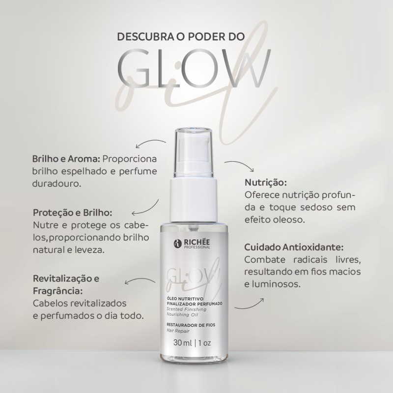 Ingredientes e benefícios: • Óleo de Argan, Óleo de linhaça, Óleo de coco: nutrição, redução de frizz, fortalecimento dos fios, brilho e maciez. Modo de Usar: - Fortalecimento e revitalização: aplique por toda extensão dos fios saturando-os, deixe agir por alguns minutos e lave em seguida. - Reestruturação e hidratação profunda: misture 9 ml do Oil Glow com Richée Professional Máscara de sua preferência e siga as orientações de aplicação da máscara. - Controle do volume e redução do frizz: aplicar algumas gotas por toda extensão dos cabelos secos diariamente. - Proteção térmica: aplique nos cabelos limpos e úmidos distribuindo no comprimento e pontas, sem enxaguar, inicie o processo de escovação. Resultado: Cabelos mais nutridos e resistentes, devido sua alta concentração de vitaminas A, E, agentes antioxidantes que aderem facilmente aos fios, evitando ressecamento e danos futuros, com realce do brilho. Sobre a linha (Home Care) A GLOW foi desenvolvida para manter os cabelos nutridos, saudáveis, brilhantes e perfumados todos os dias. Cuida dos fios sem deixá-los pesados, repara, protege de fontes de calor e tem um alto poder de hidratação para os cabelos danificados e ressecados. Sobre a marca Ser Richée é estar sempre um passo à frente. Por isso, a prevenção tem sido o forte na elaboração de produtos com qualidade profissional e acessíveis a todos os consumidores. A tecnologia e o conhecimento sobre a ação dos mais diversos ingredientes ativos da biodiversidade brasileira e mundial estão entre os aspectos importantes da marca. E a criatividade na elaboração de cosméticos que atendam a todas as exigências é um importante diferencial que permitiu à Richée estar hoje entre as marcas nacionais mais relevantes. O compromisso da Richée com a beleza real, se expressa na vontade de que os produtos tragam benefícios além da beleza externa e na identidade cultural e étnica, de modo que a beleza seja expressa de modo individual e único por cada um de nossos consumidores. Esse mesmo compromisso está presente nos mais de 30 países em que a Richée atua, reforçando ainda mais as qualidades plurais de nossos produtos. Autenticidade e sofisticação são os ingredientes fundamentais para nosso sucesso.