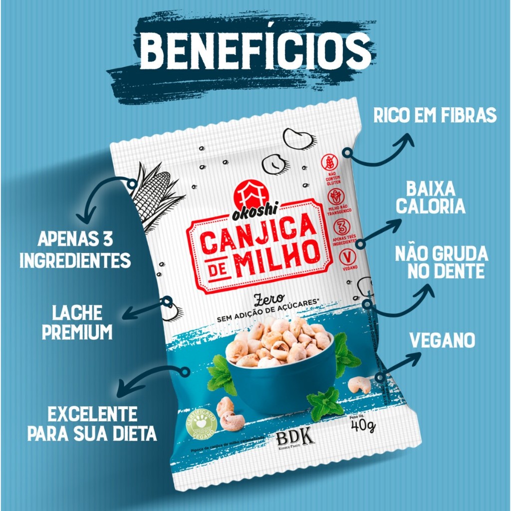O kit contém 18 pacotes de 40g cada. A pipoca de canjica é um excelente produto para incorporar à sua dieta. Além de ser mais suave do que a pipoca de milho convencional, ela não possui as cascas que grudam nos dentes e gengivas, proporcionando um lanche gostoso, saudável e agradável. Um lanche ideal para incorporar à sua dieta, pois possui baixas calorias, macronutrientes favoráveis e um alto teor de fibras, proporcionando maior saciedade sem comprometer o maravilhoso sabor. Feito com apenas 3 ingredientes: canjica não geneticamente modificada, isomalte e estévia. Perfeita para um lanche leve sem excesso de ingredientes químicos. A pipoca de canjica da Okoshi é uma excelente opção para a sua dieta, especialmente se você tiver restrições alimentares mais rigorosas, pois é um produto vegano, sem lactose, sem glúten e com certificado Kosher. A Okoshi foi fundada em 1960, quando uma família de descendência japonesa decidiu atender à comunidade japonesa que havia imigrado para a cidade de São Paulo, Brasil, fabricando produtos da cultura japonesa. A Okoshi percebeu a escassez no mercado de produtos naturais e começou a produzir alimentos para pessoas que buscam opções mais leves com ingredientes naturais e para aqueles com restrições alimentares.