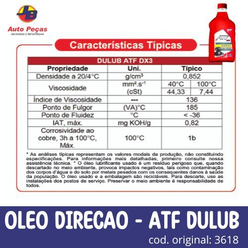 "DULUB ATF Dx3 " Fluido lubrificante mineral de alto desempenho para caixas de transferência, sistema de direção hidráulica e transmissões automáticas (ATF) de automóveis modernos. DULUB ATF DX3 foi formulado para atender aos rigorosos requisitos de fluido de transmissão da General Motors e Ford. DULUB ATF DX3 possui proteção antidesgaste superior, ótimo controle de oxidação e alto desempenho antiatrito. DULUB ATF DX3 atende aos níveis de desempenho: GM Dexron III-H; Allison C-4; Caterpillar TO-2; Ford Mercon; JASO M315-2013 1A. Aqui estão algumas características importantes do **ATF DX3 Dexron III-H**: 1. **Compatibilidade**: Este fluido é compatível com uma variedade de transmissões automáticas, especialmente aquelas que exigem a especificação Dexron III. Ele também pode ser usado em sistemas hidráulicos e outros componentes que exijam fluido de alta qualidade. 2. **Desempenho**: Proporciona um bom desempenho de mudança de marchas, ajudando a manter a suavidade e a precisão da troca de marchas. Ele também contribui para o aumento da vida útil da transmissão, minimizando o desgaste. 3. **Estabilidade Térmica e Oxidação**: A formulação do ATF DX3 é projetada para resistir à oxidação e à degradação térmica, garantindo que o fluido mantenha suas propriedades mesmo sob condições de calor extremo. 4. **Proteção contra o Desgaste**: Ele contém aditivos que ajudam a proteger as partes móveis da transmissão contra o desgaste, evitando falhas precoces e melhorando a eficiência operacional. 5. **Versatilidade**: Pode ser utilizado em uma ampla gama de veículos, incluindo carros, caminhões leves e outros tipos de máquinas que exijam fluido Dexron III-H, desde que o fabricante do veículo não indique outro fluido específico. ### Aplicações típicas: - Transmissões automáticas de veículos - Direção hidráulica - Alguns sistemas hidráulicos de veículos e máquinas Vale ressaltar que, embora o Dexron III-H seja amplamente utilizado, ele já foi descontinuado por muitos fabricantes, sendo substituído por fluidos mais avançados como **Dexron VI**. Por isso, é sempre importante verificar as recomendações do fabricante do veículo para garantir que o fluido seja o mais adequado para o seu modelo específico.