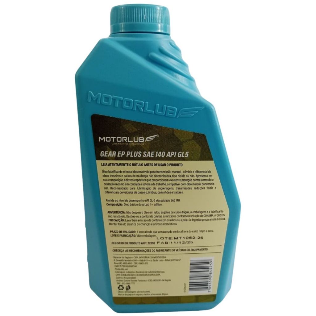 Conteúdo Da Embalagem: 1 - Oleo Cambio Motorlub Gl5 Sae90 1L Óleo De Câmbio - Proteção E Eficiência Mantenha A Transmissão Do Seu Veículo Funcionando De Maneira Eficiente Com Um Óleo De Câmbio De Alta Qualidade. Benefícios Do Óleo De Câmbio Trocas De Marcha Suaves: Reduz O Atrito E Melhora A Precisão Das Mudanças De Marcha. Maior Durabilidade: Protege Os Componentes Internos Contra O Desgaste Prematuro. Desempenho Eficiente: Mantém A Lubrificação Ideal Mesmo Em Temperaturas Elevadas. Como Escolher O Melhor Óleo? Verifique O Tipo De Câmbio: Diferentes Transmissões Exigem Fluidos Específicos (Automático, Manual, Cvt). Consulte O Manual Do Veículo: Siga As Especificações Recomendadas Pelo Fabricante. Troca Periódica: Respeite O Intervalo De Troca Para Garantir O Bom Funcionamento Da Transmissão. Perguntas Frequentes Quando Devo Trocar O Óleo Do Câmbio? O Período Varia Conforme O Tipo De Transmissão, Geralmente Entre 40.000 E 100.000 Km. Posso Usar Qualquer Tipo De Óleo De Câmbio? Não. Cada Tipo De Transmissão Exige Um Óleo Específico Para Garantir O Desempenho Ideal. Quais Os Sinais De Que O Óleo Do Câmbio Precisa Ser Trocado? Trocas Ásperas, Ruídos Incomuns E Perda De Eficiência Podem Indicar A Necessidade De Troca. Código De Barras: 7893590845204 Sku: 33300023