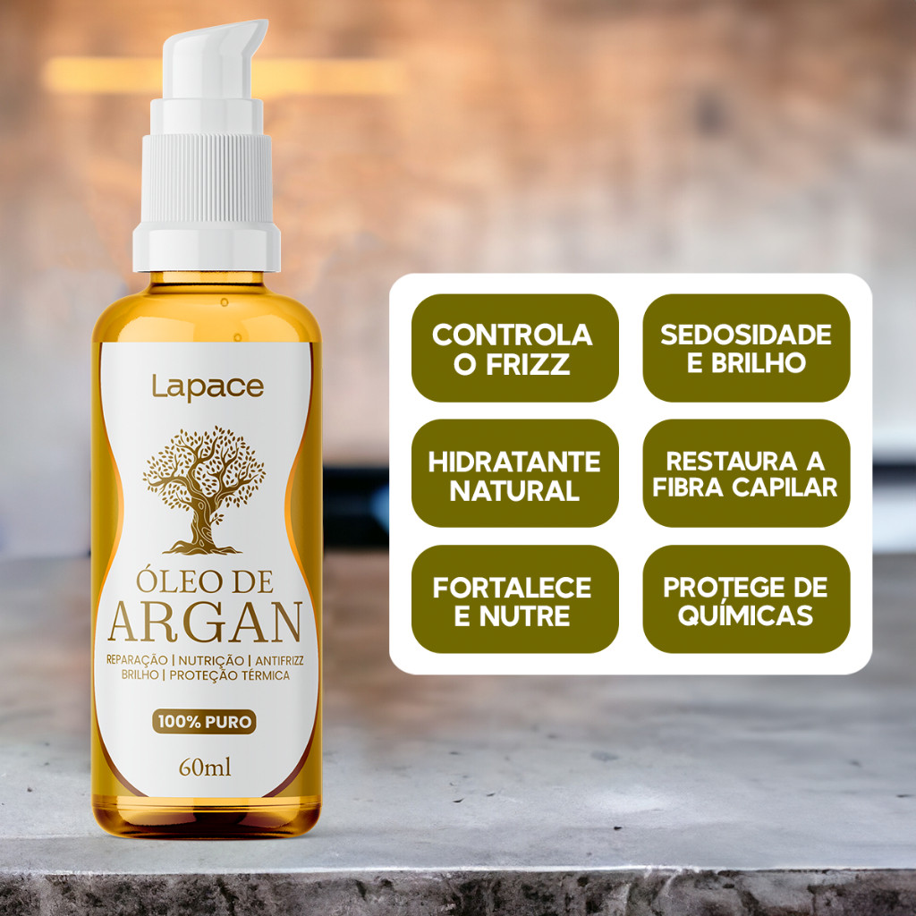Óleo Capilar Vegetal Lapace – Hidratação e Proteção para seus fios ✨ O Óleo de Argan 100% puro e natural é um poderoso aliado para a saúde capilar. Ele hidrata profundamente, ajuda a retardar o envelhecimento dos fios, fortalece a fibra capilar e revitaliza tanto o couro cabeludo quanto os cabelos. Além disso, atua como uma barreira contra os danos externos, minimizando os efeitos da poluição, sol, vento, uso frequente de secador, chapinha, piscina, mar e até mesmo processos químicos. É um verdadeiro tratamento de reconstrução para cabelos fragilizados e sem vida. A grande vantagem é que, mesmo sendo um óleo, ele não deixa os fios pesados. Sua rápida absorção garante maciez imediata, elimina os arrepiados e proporciona um brilho intenso. 🌿 Super Resultado Cabelos protegidos, com luminosidade radiante e livres do frizz. 🌟 Benefícios Cabelos disciplinados e sem frizz Movimento leve e natural Brilho intenso e duradouro Escudo contra danos químicos Hidratação profunda e natural Nutrição e fortalecimento da fibra capilar Produto vegetal, 100% puro e vegano. 💧 Modo de usar Com os cabelos limpos, aplique uma pequena quantidade do Óleo Vegetal de Argan Lapace e espalhe pelos fios. Finalize como preferir. Pode ser utilizado em cabelos secos ou úmidos.