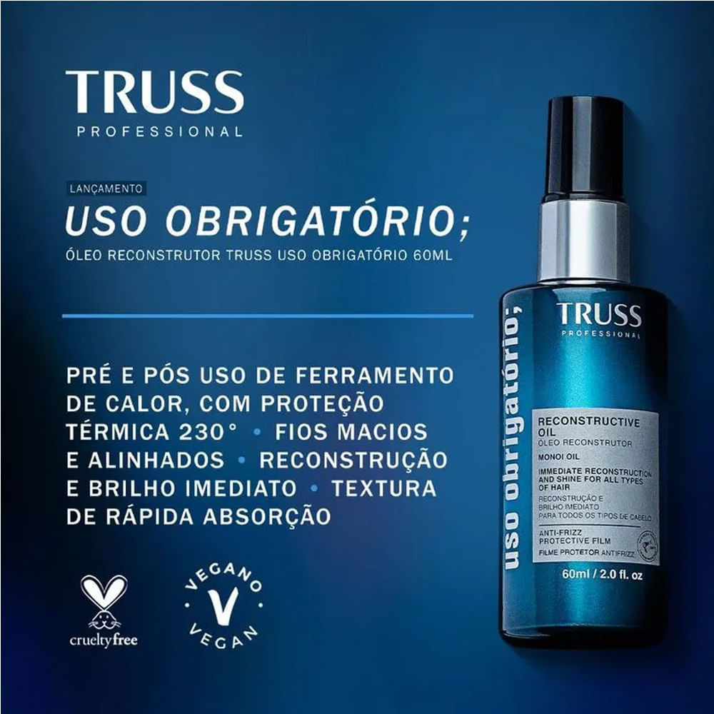 O Óleo Capilar Reconstrutor Truss Uso Obrigatório 60ml para cabelos danificados, ressecados e fragilizados. Foi desenvolvido com alta tecnologia e presente nos melhores salões de beleza do mundo, oferecendo blindagem completa contra danos térmicos, químicos e ambientais, além de proporcionar maciez, flexibilidade e controle do frizz. Além disso, sua textura leve garante rápida absorção e um acabamento impecável, sem pesar nos fios. Benefícios: - Recupera fios ressecados; - Proteção térmica; - Proporciona maciez; - Controla o frizz; - Não pesa os fios. Modo de usar: Aplique uma pequena quantidade nas palmas das mãos e espalhe no comprimento e pontas. Para o uso noturno, aplique uma quantidade generosa no comprimento e pontas e enxágue no dia seguinte. Sobre a marca: Presente nos Salões de Beleza mais exigentes, a Truss vem conquistando cada dia mais espaço e destaque no mercado de beleza devido à qualidade oferecida por seus produtos que cumprem o que prometem e apresentam recuperação capilar perceptível desde a primeira aplicação. Isso faz com que a Truss acumule uma legião de consumidoras fiéis que trazem outras #loucasportruss que acreditam que #sóquemusaentende! A Truss é uma marca jovem, de altíssima credibilidade e de sucesso absoluto nos países que atua, construindo uma história marcada por inúmeros acontecimentos importantes.
