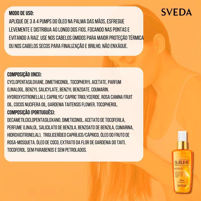 Óleo Capilar Sveda Sublime – Nutrição, Brilho e Leveza para Todos os Tipos de Cabelo O Óleo Capilar Sublime Sveda é um tratamento capilar versátil que combina uma fusão de óleos florais especiais para oferecer nutrição intensa sem pesar os fios. Com textura leve e efeito condicionante, ele promove brilho imediato, suavidade e um toque sedoso, ideal para o uso diário. Pode ser aplicado tanto antes da escova quanto como finalizador para dar aquele acabamento luminoso e saudável. Benefícios do Óleo Capilar Sveda Sublime - Nutrição sem pesar os fios - Brilho imediato e efeito luminoso - Suavidade ao toque e maciez prolongada - Textura leve com ação condicionante - Pode ser usado em todos os tipos de cabelo - Uso universal: antes ou depois da escova, ou como finalizador Principais ativos: - Fusão de Óleos Florais Especiais: uma combinação exclusiva de óleos naturais que restauram a vitalidade dos fios. - Textura leve com efeito condicionante: promove brilho e toque sedoso sem pesar. Porque escolher o Óleo Capilar Sveda Sublime? Porque ele entrega resultados visíveis desde a primeira aplicação: cabelos mais brilhosos, nutridos e com movimento natural, tudo isso com uma fórmula leve que não pesa e nem deixa resíduos. Ideal para incluir na rotina capilar diária. Como usar: Aplique de 3 a 4 pumps na palma da mão. Espalhe uniformemente no comprimento e nas pontas dos cabelos secos ou úmidos. Não é necessário enxaguar. Pode ser usado antes da escova como protetor ou após como finalizador de brilho. Perguntas frequentes sobre o Óleo Capilar Sveda Sublime 1. O óleo serve para cabelos oleosos? Sim! Sua textura leve permite o uso até em cabelos com tendência à oleosidade, desde que aplicado corretamente no comprimento e pontas. 2. Posso usar todos os dias? Pode! A fórmula foi desenvolvida para uso diário, promovendo brilho e proteção contínuos. 3. Ele substitui o condicionador? Não. É um complemento de tratamento. Pode ser usado após o condicionador ou máscara para finalizar os cuidados. 4. Posso utlizar o óleo capilar sveda com o cabelo molhado? Sim, o óleo pode ser usado com os cabelos molhados, antes da escova como protetor ou após como finalizador de brilho. O Óleo Capilar Sublime Sveda é a escolha ideal para quem busca um cuidado prático, eficaz e luxuoso para os cabelos. Com sua fórmula leve e enriquecida com óleos florais especiais, ele oferece brilho instantâneo, nutrição equilibrada e toque sedoso, sem pesar. Seja como pré-escova ou finalizador, ele se adapta à sua rotina e realça a beleza natural dos fios. Experimente e sinta a diferença desde a primeira aplicação !