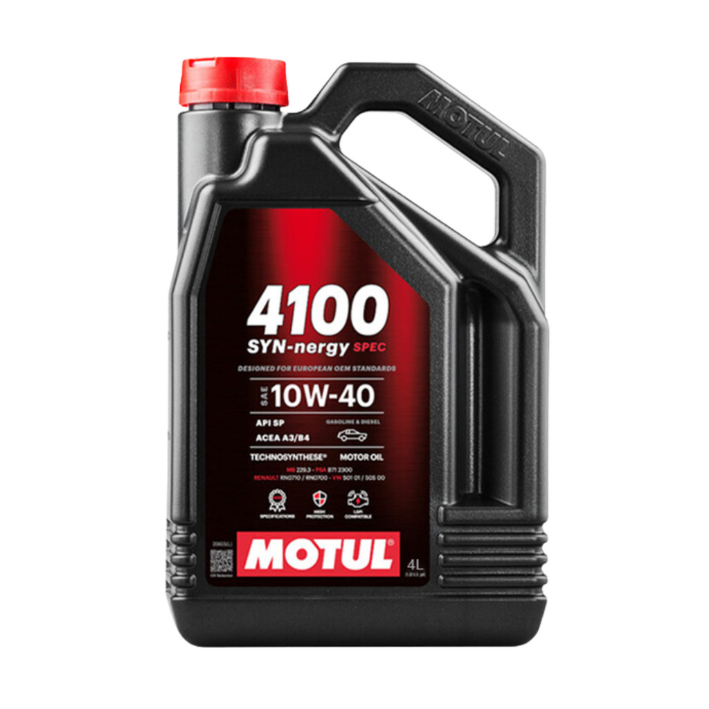 ÓLEO CARRO MOTUL 4100 SYN-NERGY SPEC 10W-40 4 LITROS Especialmente desenvolvido para motores recentes ou antigos de altas cilindradas, turbo diesel, injeção direta e sistemas de pós tratamento de gases. Adequado para todos os tipos de combustíveis: Gasolina, Álcool, Flex, Diesel ou GNV. O nível de serviço ACEA B4 exige poder de detergencia e dispersão superior bem como mais resistência contra o aumento de viscosidade causado pelas partículas nos motores diesel de injeção direta (exceto nas bombas injetoras do grupo VAG: onde é recomendado o uso do MOTUL SPECIFIC 505.01 502.00 505.00 / SAE 5W40) Normas e Aprovações: ACEA A3/B4API SL/CF MB-Approval 229.1 VW 501 01 / 505 00 RENAULT RN0700 PSA B71 2300 Lubrificante avançado com tecnologia Technosynthese® para alta proteção do motor. Especialmente desenvolvido para motores aspirados ou turbinados, com injeção indireta ou direta. Adequado para todos os tipos de combustíveis: Gasolina, Álcool, Flex, Diesel ou GNV.