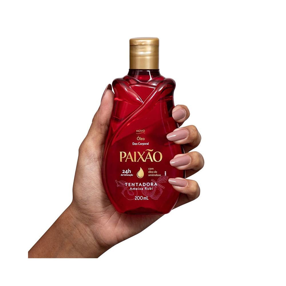 ÓLEO CORPORAL DE AMÊNDOAS PAIXÃO TENTADORA AMEIXA RUBI 200ML ============================================================ O Óleo Corporal de Amêndoas Paixão Tentadora oferece uma hidratação profunda e uma fragrância irresistível. Com uma fórmula enriquecida, ele deixa a pele macia e perfumada durante todo o dia. Proporciona até 24 horas de nutrição intensa, garantindo uma pele suave e bem cuidada o dia todo. Envolva-se em uma fragrância sensual de ameixa rubi, que permanece na pele o dia inteiro, proporcionando um toque de luxo e conforto. HIDRATAÇÃO PROFUNDA Proporciona até 24 horas de nutrição intensa, garantindo uma pele suave e bem cuidada o dia todo. FRAGRÂNCIA SEDUTORA QUE DURA Envolva-se em uma fragrância sensual de ameixa rubi, que permanece na pele o dia inteiro, proporcionando um toque de luxo e conforto. MODO DE USO =========== Para um melhor resultado, o óleo deve ser aplicado após o banho. Pode ser usado em pele úmida ou seca, garantindo uma melhor absorção. Aplique uma quantidade generosa do óleo nas mãos, preparando para a aplicação uniforme. Espalhe o óleo por todo o corpo com movimentos circulares, garantindo uma aplicação uniforme. Concentre a aplicação em áreas mais secas, como cotovelos e joelhos, para hidratação adicional. Deixe o produto absorver naturalmente ou enxágue levemente, se preferir, deixando a pele macia. APLICAÇÃO Aplique uma quantidade generosa do óleo nas mãos, preparando para a aplicação uniforme. ESPALHAR Espalhe o óleo por todo o corpo com movimentos circulares, garantindo uma aplicação uniforme. CONCENTRAR Concentre a aplicação em áreas mais secas, como cotovelos e joelhos, para hidratação adicional. FINALIZAÇÃO Deixe o produto absorver naturalmente ou enxágue levemente, se preferir, deixando a pele macia. CARACTERÍSTICAS E BENEFÍCIOS DO ÓLEO CORPORAL DE AMÊNDOAS PAIXÃO TENTADORA ========================================================================== Este óleo é indicado para todos os tipos de pele, sendo ideal para uso diário. Sua fórmula rica em óleo de amêndoas nutre profundamente enquanto perfuma a pele. Ajuda a manter uma sensação de frescura ao longo do dia com sua ação desodorante eficaz. Pode ser utilizado após o banho, garantindo melhor absorção em pele ligeiramente úmida ou seca. Enriquecido com óleos naturais como amêndoa doce, restaura a elasticidade da pele suavemente. Ideal para qualquer tipo de pele, proporcionando cuidado extra principalmente em climas secos. AÇÃO DESODORANTE Ajuda a manter uma sensação de frescura ao longo do dia com sua ação desodorante eficaz. USO VERSÁTIL Pode ser utilizado após o banho, garantindo melhor absorção em pele ligeiramente úmida ou seca. INGREDIENTES NUTRITIVOS Enriquecido com óleos naturais como amêndoa doce, restaura a elasticidade da pele suavemente. INDICADO PARA TODOS OS TIPOS DE PELE Ideal para qualquer tipo de pele, proporcionando cuidado extra principalmente em climas secos. ESPECIFICAÇÕES TÉCNICAS ======================= Formulado com componentes cuidadosamente selecionados, este óleo promove resultados satisfatórios e eficazes. Volume: 200ml Tipo: Óleo Corporal Desodorante Fragrância: Ameixa Rubi Funcionalidade: Hidratação intensiva por 24 horas Composição: Contém óleo de amêndoas SOBRE A MARCA PAIXÃO ==================== A Paixão é uma marca renomada em cuidados pessoais, conhecida por sua qualidade e fragrâncias encantadoras. Ela se destaca pela utilização de ingredientes naturais, garantindo um cuidado eficaz e sensorial. Produtos testados e aprovados por especialistas, assegurando confiança e segurança aos consumidores. A marca prioriza formulações com ingredientes naturais, preservando a saúde e a beleza da pele. Fragrâncias envolventes que proporcionam prazer e satisfação durante o uso diário. QUALIDADE RECONHECIDA Produtos testados e aprovados por especialistas, assegurando confiança e segurança aos consumidores. INGREDIENTES NATURAIS A marca prioriza formulações com ingredientes naturais, preservando a saúde e a beleza da pele. EXPERIÊNCIA SENSORIAL Fragrâncias envolventes que proporcionam prazer e satisfação durante o uso diário.