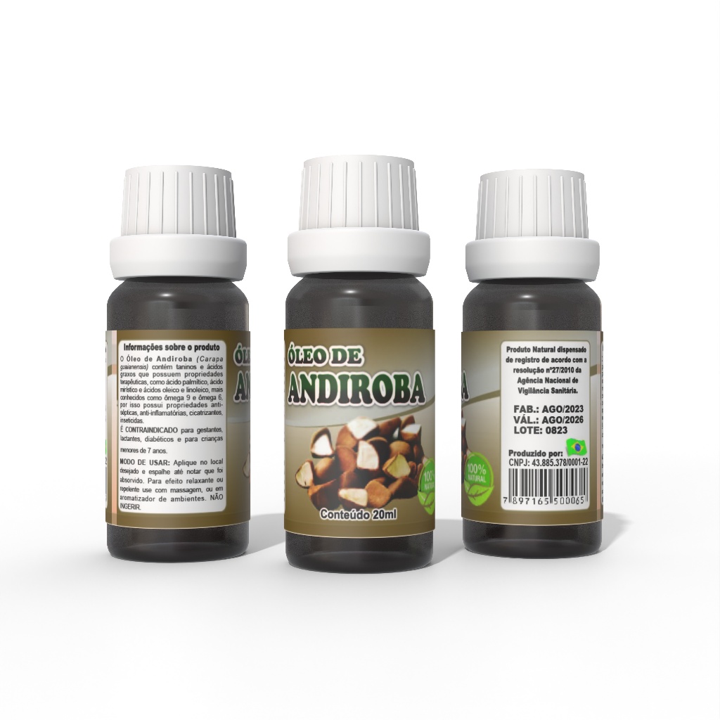 O Óleo de Andiroba contém taninos e ácidos graxos que possuem propriedades terapêuticas, como ácido palmítico, ácido mirístico e ácidos oleico e linoleico, mais conhecidos como ômega 9 e ômega 6, por isso possui propriedades antissépticas, anti inflamatórias, cicatrizantes, inseticidas. É vegetal, natural e vegano. Apresentação: em frasco de 20ml com gotejador (conta gota) e tampa lacre. ⚠️ ATENÇÃO: Este não é um óleo essencial, não sendo recomendado portanto para fins aromáticos. O método de extração a frio não é focado em extrair o cheiro do material, portanto a maioria dos óleos vegetais não possuem cheiro característico. Sua principal função é extrair as propriedades da matéria prima para ingerir/utilizar na pele. Alguns tipos de óleos necessitam de outros óleos carreadores (como amêndoas, argan e oliva) para a diluição correta e estes são em geral neutros 100% vegetais também. Assim sendo, não se recomenda o uso do óleo vegetal para aromaterapia ou para essências, pois este não é seu propósito. ----------------------- IMPORTANTE! Pode ocorrer VARIAÇÃO de tonalidade entre a imagem de exibição e o produto físico. Em caso de dúvidas, mande a sua pergunta, ficaremos felizes em falar com você :)