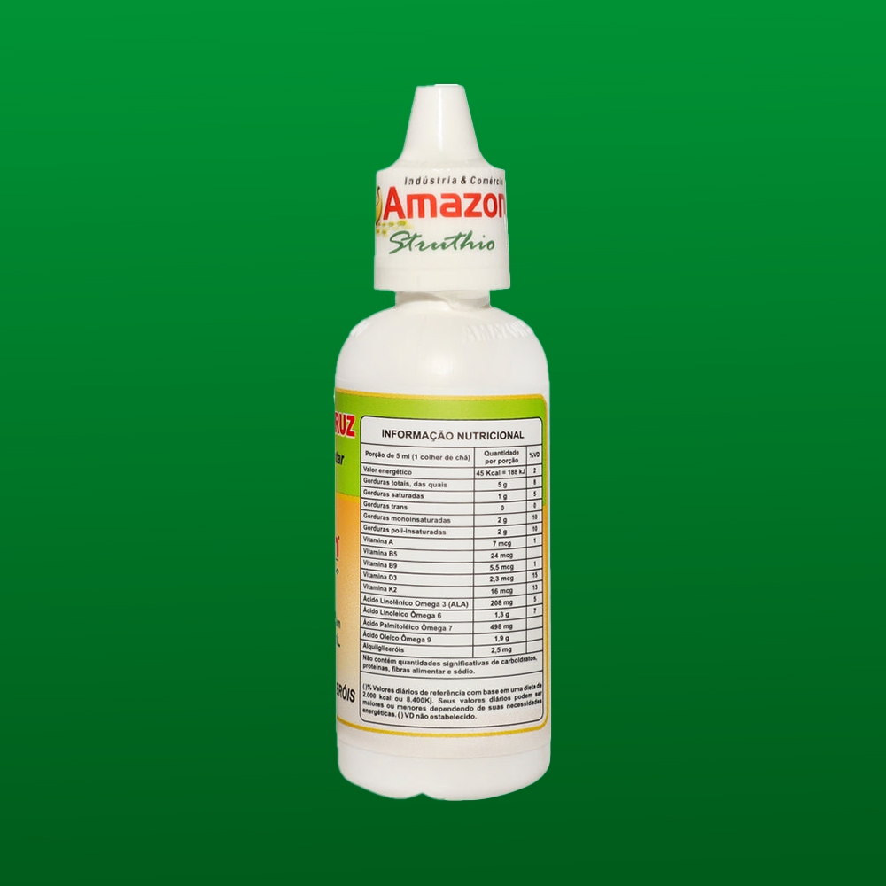 É um alimento natural que contém os ômegas 3, 6, 7 e 9, além de: Vitamina A; Vitamina B1; Vitamina B5; Vitamina B9; Vitamina D3. Benefício: -Reduz a concentração de colesterol no sangue; -Auxilia na memória e na disposição; -Auxilia na aceleração do metabolismo; -Auxilia nos sintomas associados à TPM e à menopausa. Como usar: O óleo de avestruz é um alimento natural, a indicação para usar esse alimento é tomar metade dos seus quilos em gotas. Para simplificar, se você possui 60 kg, (30 gotas) 10 gotas antes ou após cada refeição. Divida em 3x ao dia. Precauções: O Óleo de Avestruz em gotas é um alimento natural e não possui aditivos prejudiciais a saúde. Mulheres grávidas e crianças devem consultar um médico antes de consumir. A manipulação deste óleo deve seguir os padrões de qualidade, como é o caso do nosso óleo de avestruz que é aprovado pelo Ministério da Agricultura S.I.F. 1432 A manipulação deste óleo deve seguir os padrões de qualidade, como é o caso do nosso óleo de avestruz que é aprovado pelo Ministério da Agricultura S.I.F. 1432