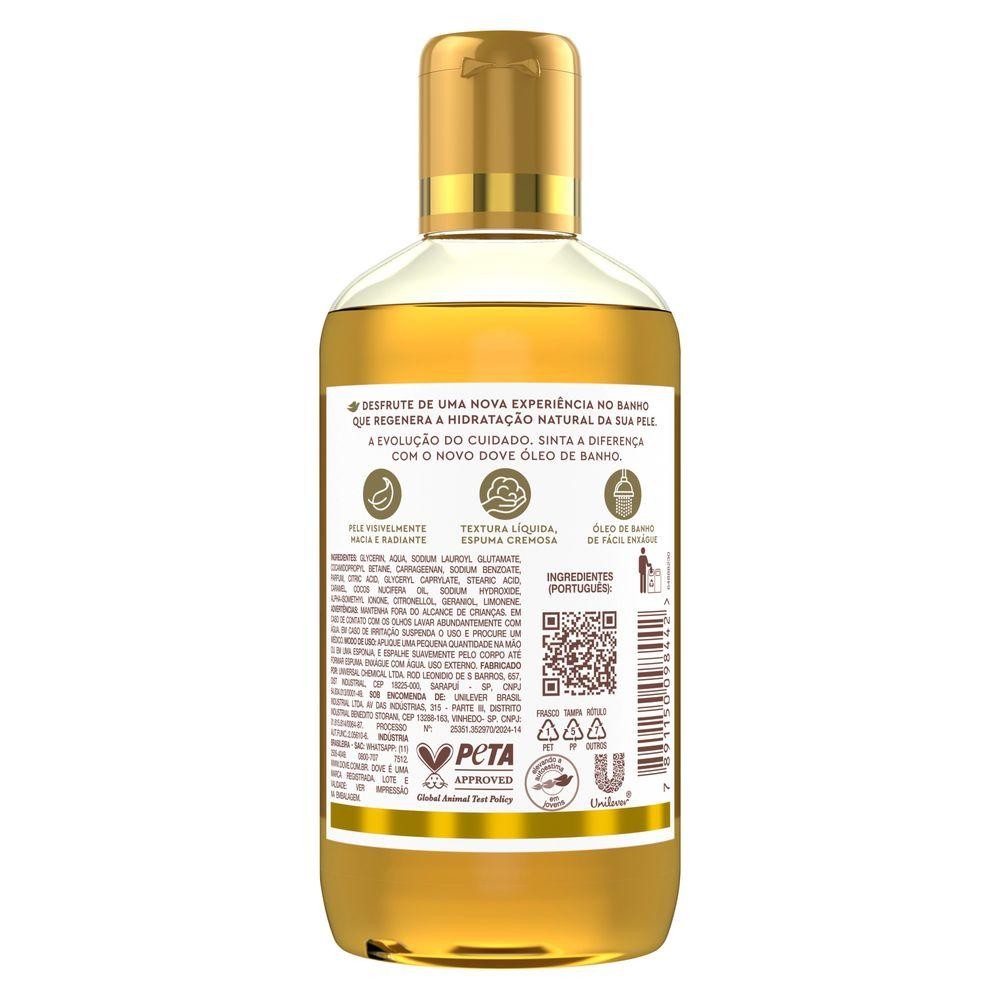 Desfrute de uma nova experiência no banho que regenera a hidratação natural da sua pele. Sinta a diferença do novo Dove Óleo de Banho e a evolução do cuidado na sua rotina de banho diária. O segredo para uma pele bonita é a hidratação diária e, com o novo Dove Óleo de Banho, sua pele ficará visivelmente macia e radiante. Este Sabonete Líquido Óleo de Banho glicerinado possui uma formulação que conta com 96% dos ingredientes de origem natural, que renovam e nutrem a sua pele, oferecendo hidratação intensa e limpeza delicada. Sua fórmula nutre e hidrata a pele enquanto limpa, deixando-a com uma sensação macia e bem cuidada. O Dove óleo de banho glicerinado possui uma textura líquida e faz espuma cremosa durante o banho, além de oferecer uma fragrância gostosa e duradoura na pele, promovendo um banho envolvente e relaxante. Dove Óleo de Banho é de fácil enxágue, garantindo hidratação para a sua pele sem deixar uma sensação oleosa ou vestígios de produto na pele ou no chão do seu banheiro. Para uma melhor experiência no banho, sugerimos o seguinte modo de uso: aplique uma pequena quantidade na mão ou em uma esponja e espalhe suavemente pelo corpo, até formar espuma. Em seguida, massageie a espuma pelo seu corpo e, por último, enxágue com água morna. Uso externo. Dove Óleo de Banho pode ser usado diariamente no corpo e mãos. Eleve a sua experiência de banho com o novo Dove Óleo de Banho! Dove é certificada Cruelty-Free pela PETA, sendo assim, não realizamos e nem realizaremos testes em animais em nenhum lugar do mundo.