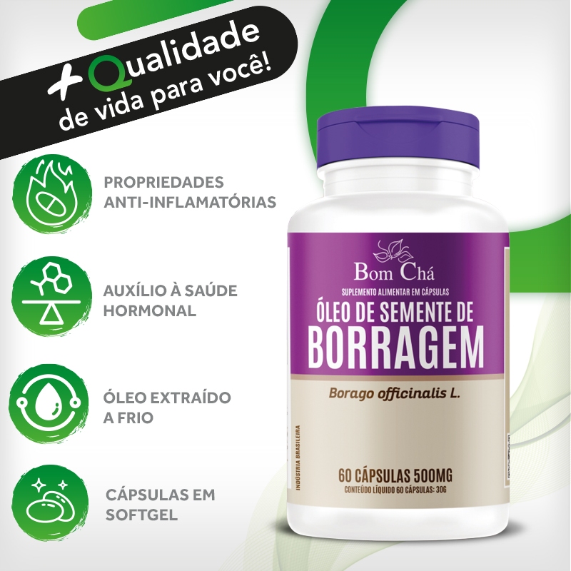 Desperte o Poder do Óleo de Borragem com Vitamina E com a Bom Chá! Vantagens da Equality Suplementos: Qualidade Superior: Comprometidos com a excelência, nossos produtos são formulados com ingredientes de alta qualidade, garantindo que você tenha acesso ao melhor para sua saúde. Preços Acessíveis: Acreditamos que a saúde deve ser acessível a todos, por isso oferecemos produtos de qualidade a preços justos, permitindo que todos possam cuidar de seu bem-estar. Confiança na Bom Chá: Há anos, a Bom Chá é reconhecida por sua integridade e compromisso com a saúde. Nossa reputação é construída sobre produtos confiáveis e eficazes, com o compromisso de garantir igualdade no acesso aos melhores suplementos. Eleve sua saúde com o Óleo de Borragem com Vitamina E da Bom Chá. Descubra o poder da natureza em cada cápsula e aproveite os benefícios para sua saúde e bem-estar! INFORMAÇÕES IMPORTANTES: "ESTE PRODUTO NÃO É UM MEDICAMENTO" "ESTE PRODUTO É UM SUPLEMENTO ALIMENTAR" "MANTENHA FORA DO ALCANCE DE CRIANÇAS" "NÃO EXCEDER A RECOMENDAÇÃO DIÁRIA DE CONSUMO INDICADA NA EMBALAGEM" Conservar ao abrigo da luz, calor e umidade. Este produto não é um medicamento. Produto dispensado de registro conforme RDC 240/2018. Aspecto visual: cápsula gelatinosa mole, incolor, em formato 10 oval. Peso médio (invólucro + conteúdo): aprox. 700mg Peso médio (conteúdo): 500mg