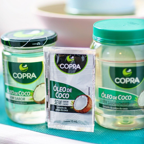 O Óleo de Coco Sem Sabor Copra foi desenvolvido com exclusividade para uso culinário. Com sabor neutro, é alternativa para outros óleos vegetais, pois além de ser zero gordura trans e não hidrogenado, possui em sua composição uma predominância de gorduras boas que facilitam a digestão e absorção pelo nosso corpo. Naturalmente rico em ácido láurico e TCM (Triglicerídeos de Cadeia Média), nosso Óleo de Coco Sem Sabor é extraído da polpa do coco sem adição de nenhum componente químico ou conservantes. Outro detalhe que faz a diferença no preparo dos alimentos, é que o Óleo de Coco Sem Sabor mesmo exposto a altas temperaturas mantém suas propriedades inalteradas, podendo ser usado como ingrediente culinário em diversas receitas doces e salgadas, além de fritar, saltear e temperar saladas sem alterar o sabor da sua comida. SUGESTÃO DE CONSUMO Óleo de Coco Sem Sabor pode substituir os demais óleos na cozinha, pois é um produto com capacidade de suportar altas temperaturas sem sofrer modificação em seus componentes nutricionais. Por isso, ele é considerado um óleo estável, além de mais saudável, pois não apresenta gordura trans, que é gerada pelo processo de hidrogenação, presente na maioria dos óleos de origem vegetal.