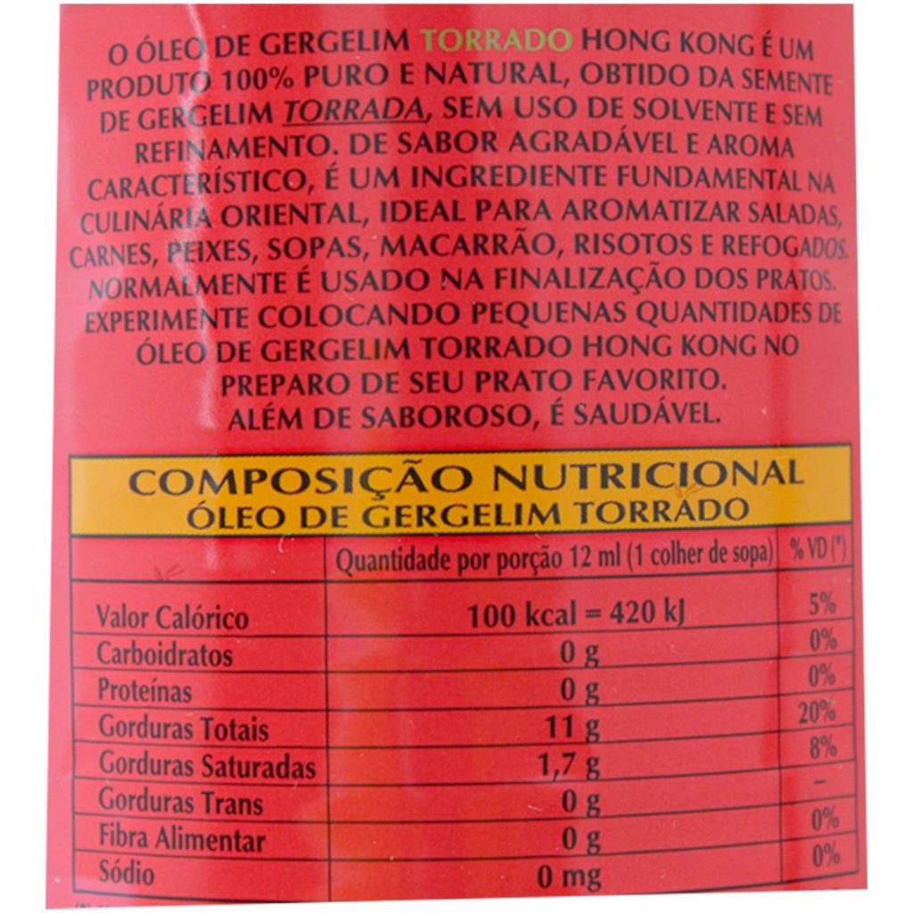 Óleo De Gergelim Torrado 500ml Hong Kong O Óleo de Gergelim Torrado Hong Kong é um produtos 100% puro e natural, obtido da semente de gergelim torrada, sem uso de solvente e sem refinamento. É um ingrediente fundamental na culinária oriental, sendo utilizado no preparo do molho de Yakisoba e é ideal para aromatizar saladas, carnes, peixes, sopas, macarrão, risotos e refogados. Normalmente é usado na finalização dos pratos. Experimente colocando pequenas quantidades de óleo de gergelim torrado Hong Kong no preparo de seu prato favorito. Além de saboroso, é saudável. Ingredientes: semente de gergelim. NÃO CONTÉM GLÚTEN. Preparo: Pronto para uso. Basta adicionar na sua receita preferida. Conservação: Conservar em local fresco, afastado da luz e do calor. Contém: 500ml. Marca: Hong Kong. Origem: Brasil.