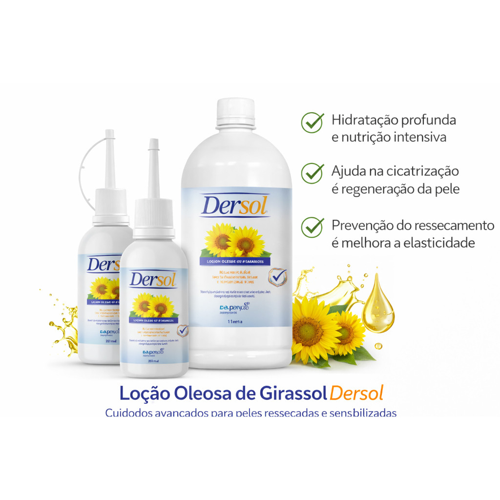 O Óleo de Girassol Dersol BELLA PHYTUS é um produto dermatológico de alta qualidade, desenvolvido para hidratar, nutrir e proteger a pele, especialmente em casos de ressecamento, sensibilidade ou necessidade de cuidado intensivo. Rico em Ácidos Graxos Essenciais (AGE) e Vitamina E, auxilia na regeneração da pele, promovendo maciez, elasticidade e conforto. Sua fórmula forma uma barreira protetora, ajudando a prevenir a perda de umidade e favorecendo a recuperação da pele, sendo ideal tanto para o uso diário quanto para cuidados específicos. Benefícios ✔️ Hidratação profunda e nutrição intensiva ✔️ Auxilia na regeneração e proteção da pele ✔️ Ajuda a prevenir o ressecamento e a descamação ✔️ Rico em Ácidos Graxos Essenciais e Vitamina E ✔️ Uso cosmético e dermatológico Indicações Peles secas, sensíveis ou ressecadas Cuidados corporais e massagens Auxilia em processos de recuperação da pele Uso diário conforme necessidade Modo de usar Aplicar uma pequena quantidade sobre a pele limpa e seca, espalhando suavemente até completa absorção. Utilizar de 1 a 3 vezes ao dia ou conforme orientação profissional. Conteúdos disponíveis: 100ml, 200ml ou 500ml Uso externo.