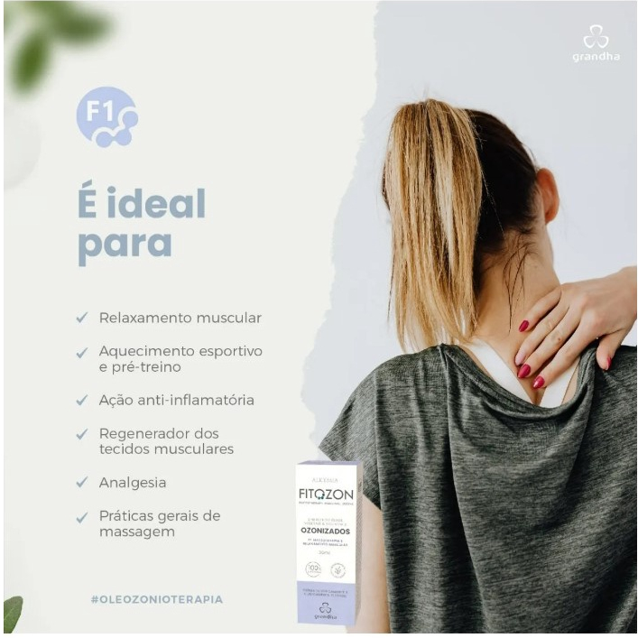 Massoterapia e Relaxamento Muscular Atenção aos praticantes de atividade física! Sofrer com dores musculares e microinflamações já não é mais uma opção. Com F1 de Fitozon, uma sinergia cuidadosamente elaborada para a prática de massagens, você pode relaxar e aliviar a dor muscular. Composto por óleos de girassol ozonizado, arnica e calêndula, além de óleos essenciais de cânfora, gengibre e patchouli, essa fórmula é ideal para quem quer cuidar do corpo com produtos naturais e veganos. A linha Fitozon de Alkymia di Grandha apresenta uma nova tendência em aromaterapia de alto desempenho, com foco nos cuidados e protocolos de saúde integrativa, beleza e bem-estar. É um dermocosmético de uso terapêutico, clinicamente e dermatologicamente testado, associado à tecnologia do ozônio medicinal em óleos fixos. Fitozon F1 é um cosmecêutico seguro e eficaz, seguindo o "Protocolo de Madri", que estabelece as condições de segurança e eficácia para uso e aplicação deste recurso. Experimente já e sinta a diferença em seu corpo com a exclusiva sinergia de óleo ozonizado com óleos essenciais e óleos vegetais preservados. Além disso, você pode se sentir bem ao escolher um produto que não foi testado em animais. Cuide de si mesmo com Fitozon F1. F1 de Fitozon é uma sinergia modulada para a prática de massagens com amplo potencial de analgesia e suavização dos processos microinflamatórios dos tecidos musculares. Indicado para a prática esportiva e aplicação antes e após treinos físicos. Óleo de Girassol Ozonizado Óleo Vegetal Preservado de Arnica Óleo Vegetal Preservado de Calêndula Óleo Essencial de Cânfora Óleo Essencial de Gengibre Óleo Essencial de Patchouli Ideal para: RELAXAMENTO MUSCULAR AQUECIMENTO ESPORTIVO E PRÉ-TREINO AÇÃO ANTI-INFLAMATÓRIA REGENERADOR DOS TECIDOS MUSCULARES ANALGESIA PRÁTICAS GERAIS DE MASSAGEM MODO DE USO Aplicar sobre a zona desejado, massageando suavemente para melhor absorção. Usar em massagens corporais. CONTRAINDICAÇÕES Não usar em gestantes, pessoas com hipertiroidismo, anemia severa ou hemorragia ativa. SOBRE A LINHA FITOZON A linha Fitozon de Alkymia di Grandha contempla a aplicação do ozônio medicinal em óleos fixos, integrando o melhor da engenharia cosmética e da tecnologia de processos industriais para cumprir o "Protocolo de Madri", documento base internacional que estabelece as condições de eficácia e segurança para uso e aplicação deste recurso. Estas preparações são associadas a outros óleos essenciais com seus benefícios extraordinários para fins específicos. A linha Fitozon de Alkymia di Grandha apresenta uma nova tendência em aromaterapia de alto desempenho, com foco nos cuidados e protocolos de saúde integrativa, beleza e bem-estar. 100% NATURAL 100% VEGANO AROMATERAPIA DE ALTO DESEMPENHO DERMOCOSMÉTICO DE USO TERAPÊUTICO COSMECÊUTICO ASSOCIADO À TECNOLOGIA DO OZÔNIO MEDICINAL DERMATOLOGICAMENTE TESTADO CLINICAMENTE TESTADO EXCLUSIVA SINERGIA DE ÓLEO OZONIZADO COM ÓLEOS ESSENCIAIS E ÓLEOS VEGETAIS PRESERVADOS NÃO TESTADO EM ANIMAIS