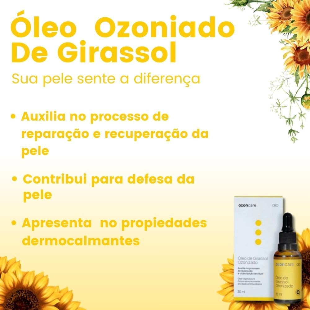 Óleo de Girassol Ozonizado - Cuide da Sua Pele com a Poderosa Ação do Ozônio # Produto Vegano # Com ativos naturais # Dermatologicamente Testado # Booster de Ozônio Concentrado Óleo de Girassol Ozonizado 30ml Benefícios: • Hidratação e proteção da pele; • Nutrição e revitalização; • Ação calmante; • Propriedades antioxidantes; • Cuidado diário eficaz; • Defesa contra microrganismos patogênicos; • Auxilia na ativação da microcirculação; No óleo ozonizado, os princípios ativos resultantes da reação de ozonização dos óleos vegetais são os hidroperóxidos e outros produtos de peroxidação lipídica. Um dos principais e mais conhecidos mecanismos de ação do ozônio está relacionado à sua atividade oxidativa, contribuindo para a defesa da pele contra microrganismos patogênicos. > Além disso, o óleo ozonizado é um produto multirreparador que suaviza e protege a função da barreira da pele. > Composição: Óleo da Semente de Girassol Ozonizado.
