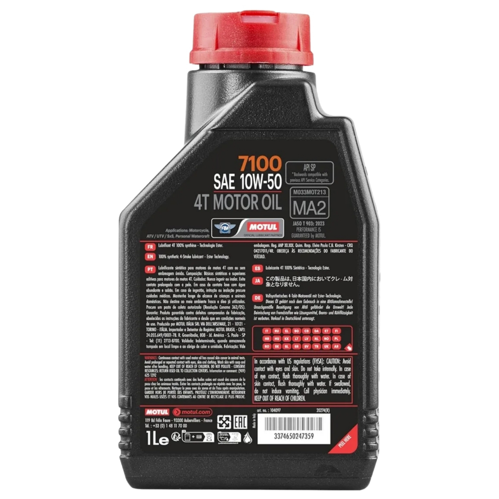 Óleo de Motor Motul Sintético Ester 7100 10W50 4T 1L CÓDIGO: COD_7759 APLICAÇÕES: • Ideal para motos de média e alta cilindrada com motor 4 tempos, com embreagem úmida, perfeito para motos esportivas, naked, big trails, touring, entre outras. ESPECIFICAÇÃO TÉCNICA: • Marca: Motul • Linha: 7100 4T Motor Oil • Viscosidade: 10W50 • Volume: 1 Litro • Tipo: 100% Sintético com base Ester • Padrão JASO: Jaso Ma2 Under N° M033MOT162 • Padrão API: API SN CONTEÚDO EMBALAGEM: • 1x Óleo de Motor 7100 4T 10W50 VANTAGENS: • Tecnologia Ester 100% sintética – Forma uma película de alta resistência, reduzindo o atrito interno e o desgaste do motor. • Resistência térmica superior – Mantém a viscosidade mesmo em temperaturas elevadas e uso extremo. • Reduz o consumo de óleo e melhora o desempenho do motor – Excelente estabilidade contra oxidação e evaporação. Alta performance em todas as rotações! O Motul 7100 10W50 4T é um óleo 100% sintético com tecnologia Ester, desenvolvido especialmente para motocicletas de alta cilindrada, uso esportivo, urbano ou estradeiro. Garante máxima proteção ao motor, câmbio e sistema de embreagem mesmo nas condições mais extremas. !!!!!!!!!!!!!!! IMAGENS MERAMENTE ILUSTRATIVAS !!!!!!!!!!!!!!! SOBRE NOSSA EMPRESA: Somos uma organização com anos de experiência no mercado. Seja você um apaixonado por velocidade, um aventureiro de estrada ou um entusiasta da personalização, cumprimos a missão de fornecer peças e acessórios da mais alta qualidade para elevar sua experiência de pilotagem a um novo patamar. UTILIZE O CAMPO DE PERGUNTAS PARA TIRAR SUAS DÚVIDAS, e apenas confirme a compra em caso de CERTEZA de compatibilidade do produto!