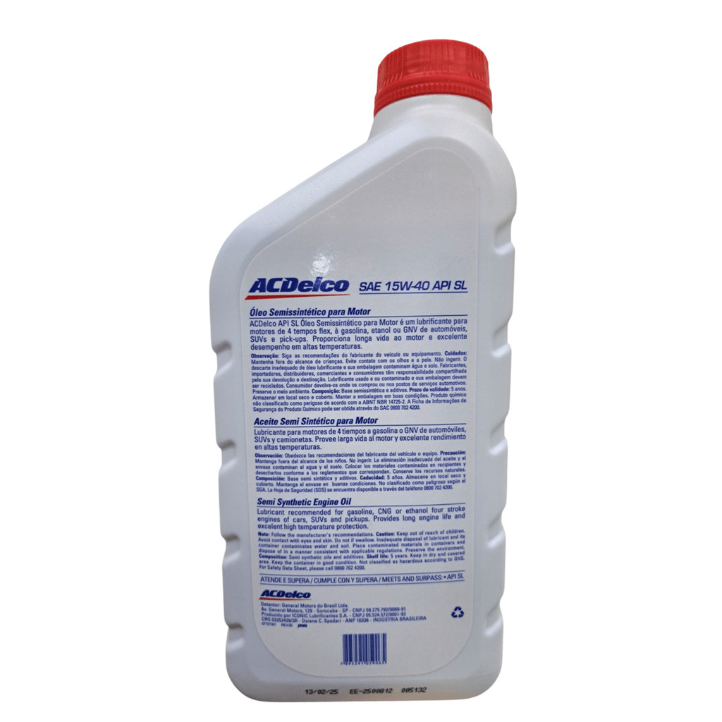 Óleo de Motor SAE 15W40 API SL Semissintético Acdelco - 1l Código: 98550553 Óleo de Motor SAE 15W40 API SL Semissintético Acdelco - 1l é um lubrificante para motores de 4 tempos flex, à gasolina, etanol ou GNV de automóveis, Suvs e pick-ups. Proporciona longa vida ao motor e excelente desempenho em altas temperaturas.