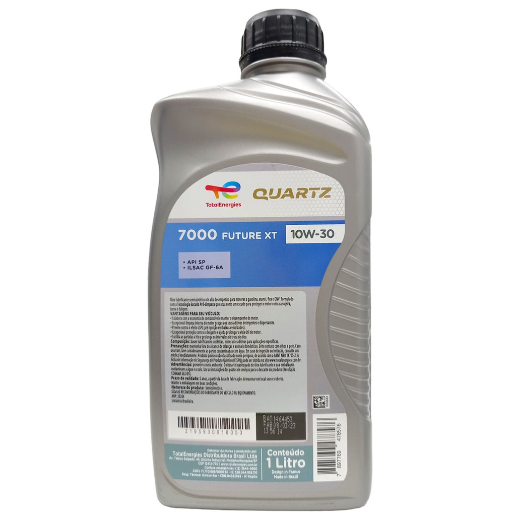 Óleo de Motor Total Quartz 7000 Future XT 10W30 SP Semi Sintético Para Motores a Gasolina, Etanol, Flex e GNV - 1LT TOTAL QUARTZ 7000 FUTURE GF-6A 10W-30 é um óleo semissintético de nova geração, economizador de combustível para motores a Gasolina e Etanol de veículos de passeio. Atende às especificações Honda, Kia e Toyota. Especificações: API SP ILSAC GF-6A Benefícios: Reduz a emissão de poluentes; Boa resistência à oxidação do motor; Excepcional estabilidade térmica; Prolonga a vida útil do motor. TOTAL QUARTZ 7000 FUTURE GF-6A 10W-30 é recomendado para todos os motores a gasolina e etanol de veículos de passeio e utilitários de última geração. TOTAL QUARTZ 7000 FUTURE GF-6A 10W-30 satisfaz as mais severas condições de utilização ( estradas , circulação urbana intensa ) em todas as estações climáticas. TOTAL QUARTZ 7000 FUTURE GF-6A 10W-30 é adequado aos motores equipados com catalisadores . TOTAL QUARTZ 7000 FUTURE GF-6A 10W-30 proporciona economia de combustível. Reduzir as emissões de poluentes Fornecer ao óleo uma boa resistência à oxidação . Excepcional estabilidade térmica Proteger as peças , mesmos as mais sensíveis , contra o desgaste ( desgaste de comando, desgaste de anéis, pistões , camisas) Prolongar a vida útil do motor