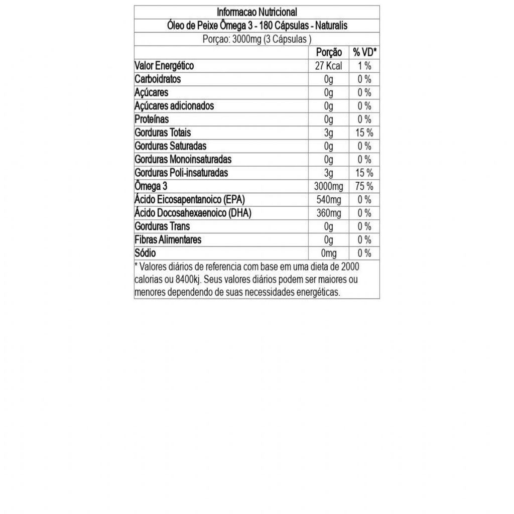 O ômega-3 não é produzido pelo organismo, por isso, deve ser obtido por meio da alimentação. Seus principais constituintes são os Ácidos Graxos EPA e DHA, que auxiliam na manutenção de níveis saudáveis de triglicerídeos, desde que associados a uma alimentação equilibrada e hábitos de vida saudáveis. Os óleos de peixe da Naturalis estão na forma Triglicerídeo (TG) e, por isso, apresentam melhor absorção e aproveitamento do Ômega-3 pelo organismo. Além disso, possui vitamina E em sua composição, que atua como antioxidante a fim de preservar o ômega-3. Composição: Cada cápsula fornece 180mg de EPA e 120mg de DHA. Como Tomar Modo de Usar: Aconselha-se a ingestão de uma cápsula, três vezes ao dia, antes das principais refeições. Ingredientes Óleo de Peixe (Composto por Óleo de Peixe e Antioxidante Mix de Tocoferol). Cápsula: Gelificante: Gelatina Bovina, Umectante: Glicerina INS 422, Veículo: ÁGua Purificada. ALÉRGICOS: CONTÉM DERIVADOS DE PEIXE. PODE CONTER DERIVADOS DE SOJA. NÃO CONTÉM GLÚTEN. Pessoas que apresentem doenças ou alterações fisiológicas, mulheres grávidas e lactantes devem consultar o médico antes de consumir este produto. Pessoas alérgicas a peixes e crustáceos devem evitar o consumo deste produto. O Ministério da Saúde adverte: Não existem evidências científicas comprovadas que este alimento previna, trate ou cure doenças. ...