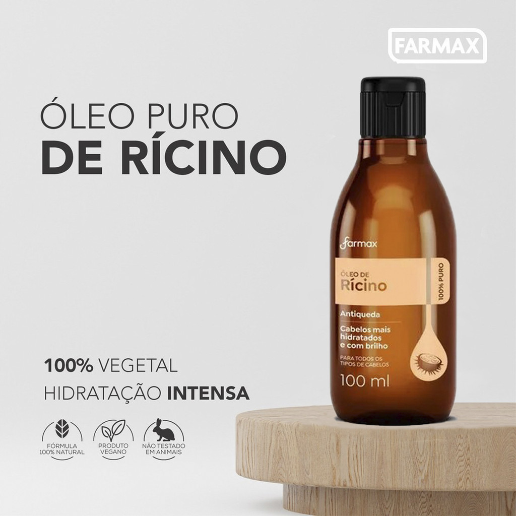 ÓLEO DE RÍCINO FARMAX 100ML O Óleo de Rícino Farmax é um produto puro, desenvolvido com base em um único ativo de origem natural e por isso possui formulação vegana. Ele auxilia no crescimento, combate a queda de cabelos e promove a hidratação dos fios, deixando-os macios e radiantes. Principalmente utilizado para melhorar a saúde dos cabelos, também é utilizado para promover seu crescimento e mantê-lo hidratado. Assim como todos os produtos Farmax o Óleo de Rícno Puro Farmax não passa por testes em animais durante seu processo de produção. MODO DE USAR: Com os cabelos secos ou úmidos, aplique no couro cabeludo e faça massagens circulares para obtenção de resultados no crescimento e ação antiqueda. Aplique também nos fios capilares para hidratação, restauração do brilho e nutrição dos cabelos. PRECAUÇÕES: Uso externo. Manter fora do alcance das crianças. Proteger da luz solar direta e do calor excessivo. Não aplicar sobre a pele ou couro cabeludo irritado. Em caso de sensibilização, suspenda o uso e procure orientação médica. Atenção: O produto pode sofrer variação de cor por ser um produto natural.