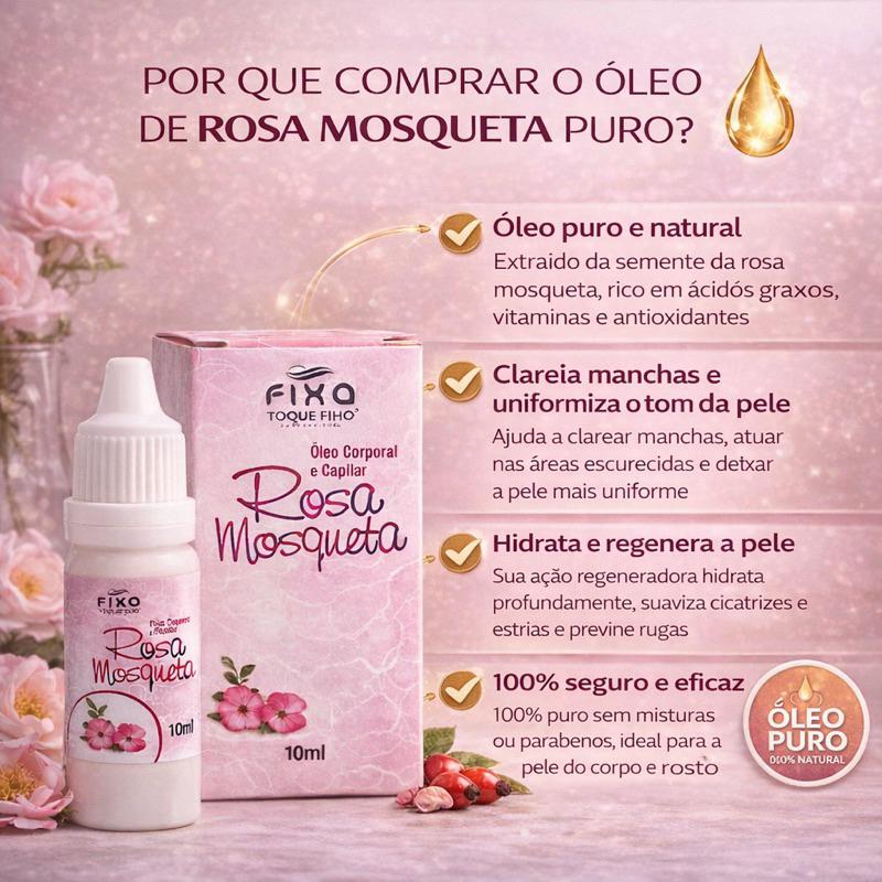 Óleo de Rosa Mosqueta 100% Puro é Original para Pele Manchada Clareia e Hidrata Fixa Cosméticos 10ml