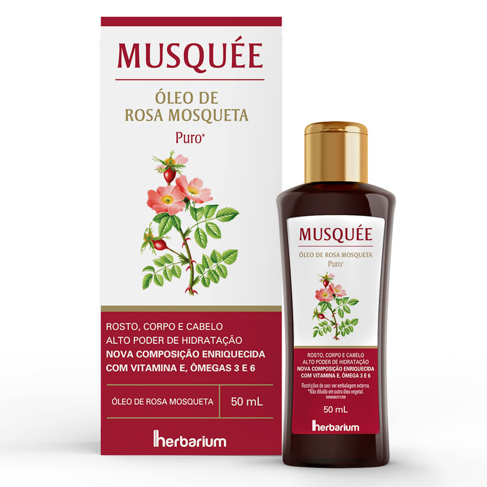 ÓLEO DE ROSA MOSQUETA MUSQUÉE HERBARIUM Óleo revitalizante com Vitamina E. Suas propriedades emolientes conferem lubrificação à pele, mantendo a hidratação natural. Com fragrância suave e alto rendime