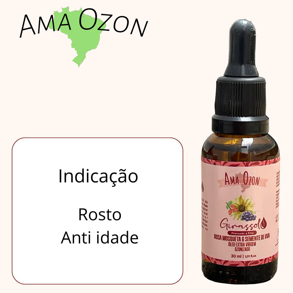 Oleo de Ozonio Para o Rosto com Mix de Oleos Ozonizados de Rosa Mosqueta Girassol e Semente de Uva 30ml Ama Ozon ---- Voce sabia que alem dos beneficios do Oleo de Rosa Mosqueta, quando voce o combina em Sinergia com o Ozonio e multiplicado por varias vezes o seu beneficio? Alem disso a base e feita no Oleo de Girassol que e o melhor condutor do Ozonio. O que e Ozonio? O ozonio e um gas composto por 3 atomos de oxigenio que tem importantes propriedades analgesicas, anti-inflamatorias e anti-septicas, alem de ter um efeito de melhora da oxigenacao dos tecidos, assim como fortalecimento do sistema imune. Testemunhos frequentes vem nos surpreendo dos incriveis beneficios do Ozonio. DIFERENCIAL DO NOSSO PRODUTO: 1 - Seguimos o PROTOCOLO DE MADRI, que e o mais importante e rigoroso parametro de qualidade do mundo para a Ozonioterapia. 2 - Utilizamos o Oleo de Girassol do Vigesimo Segundo Dia como base, que e o mais puro oleo de Girassol do Brasil, onde somos o unico autorizado a utilizar esse oleo tao puro e rico aqui no Brasil. 3 - Alem dos beneficios ja existentes no Oleo de Girassol Ozonizado do Vigesimo Segundo Dia, devido as suas propriedades imunologicas, antibacterianas e capacidade de oxigenacao, nos da Ama Ozon potencializamos e direcionamos seus beneficios a outros oleos como Oliva, Menta, Rosa Mosqueta, Arnica, Canfora, Cenoura, Urucun, Citronela, Melaleuca, Copaiba entre outros, que fazem com que alcancamos resultados incriveis para os mais diversos tipos de males. 4 - Produto Vegano 100% Natural -- Alem dos beneficios do Oleo de Girassol Ozonizado quando em sinergia com os ativos acima tem resultado aumentado para: *Manchas no Corpo e Pele, *Acne e espinhas *Anti Rugas *Anti Idade *Acao Firmadora Melhorando Elasticidade da Pele *Dermatite *Psoriase *Clareador de Manchas *Atenua Estrias, Cicatrizes *Entre outras ----- Voce Recebera: 01 - Oleo Ozonizado Rosa Mosqueta e Semente de Uva 30ml Ama Ozon