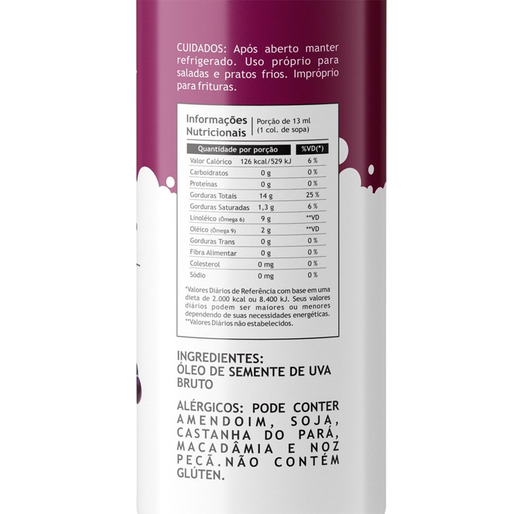 🌿 Óleo de Semente de Uva Extra Virgem Pazze 250ml | Prensado a Frio Óleo 100% natural extraído da semente de uva, com sabor suave e textura leve, ideal para temperar saladas e finalizar pratos especiais. 💡 Sugestão de uso: ➡️ Utilize como tempero de saladas ou na finalização de pratos. ➡️ Não aquecer para preservar as características naturais. 🧪 Composição: Óleo de semente de uva extra virgem prensado a frio ⚠️ Informações adicionais: ❌ Não contém glúten ✅ Produto 100% vegano ⚠️ Contraindicado para pessoas com alergia aos componentes da fórmula 📦 Armazenar em local seco, arejado e protegido da luz solar 📋 Registro: Produto autorizado para comercialização conforme normas da ANVISA